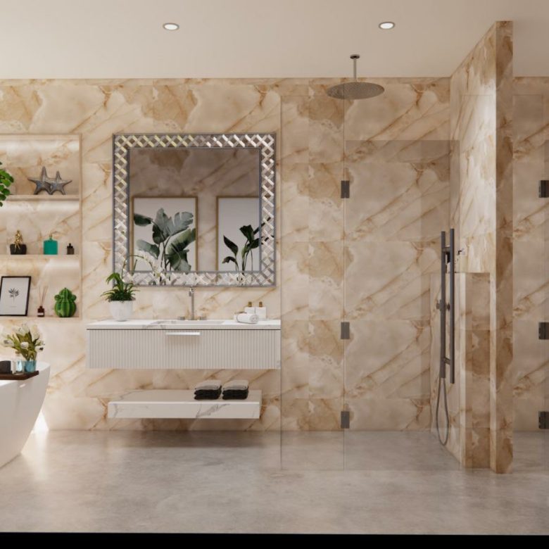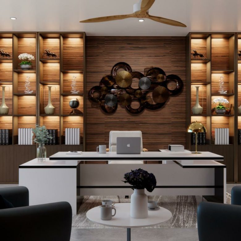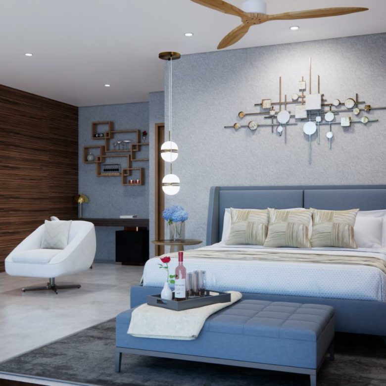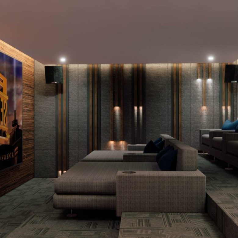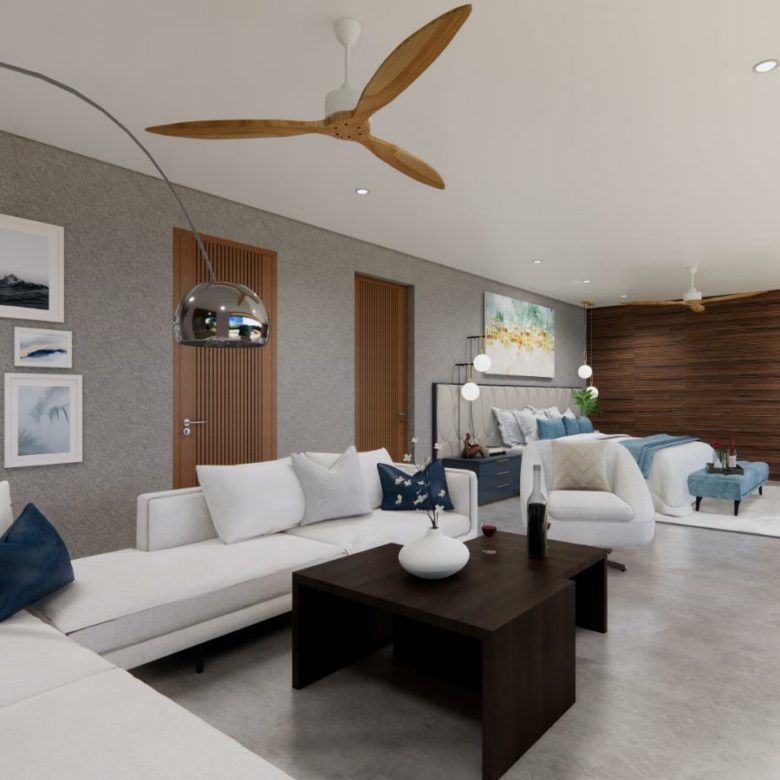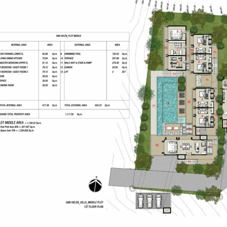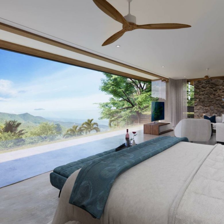 The master suite is at the top level of the villa accessible by lift and stairs and takes up the entire floor above the living room . 4 other self-contained bedrooms are featured as well as a gym, fitness centre, open plan kitchen and living area and a home cinema .