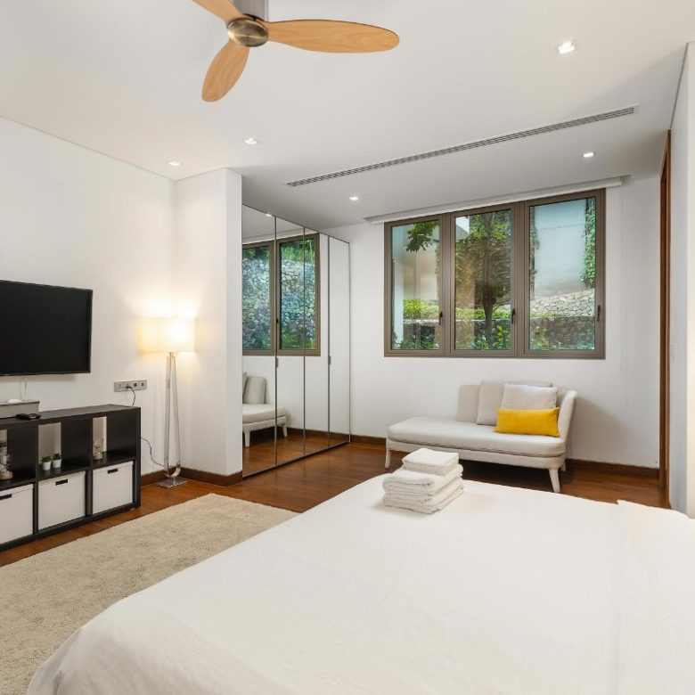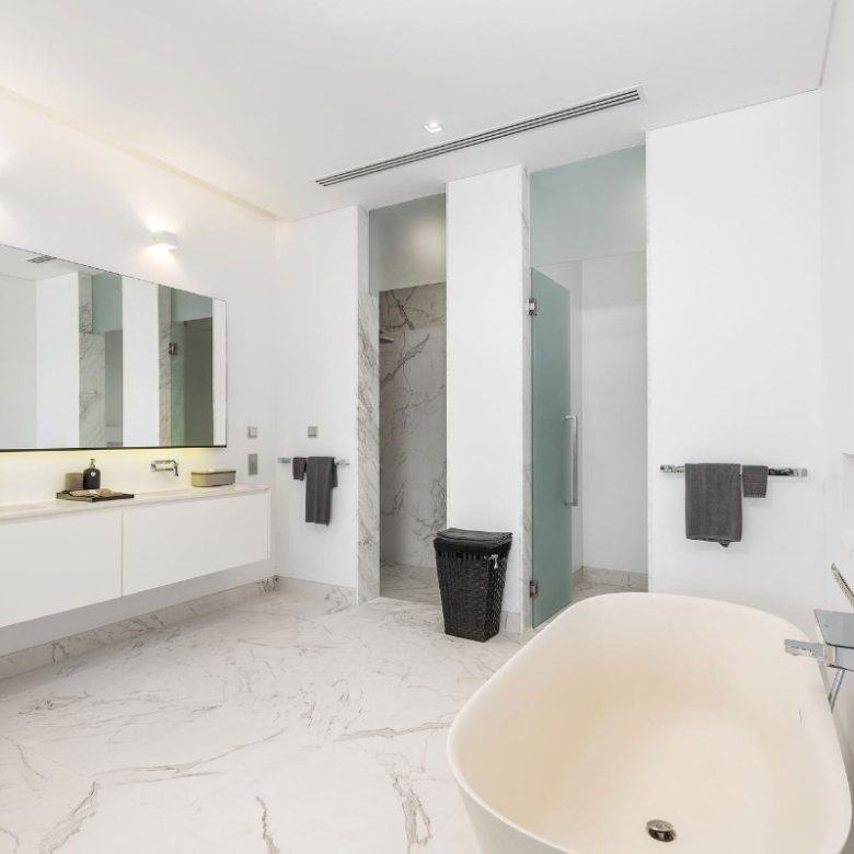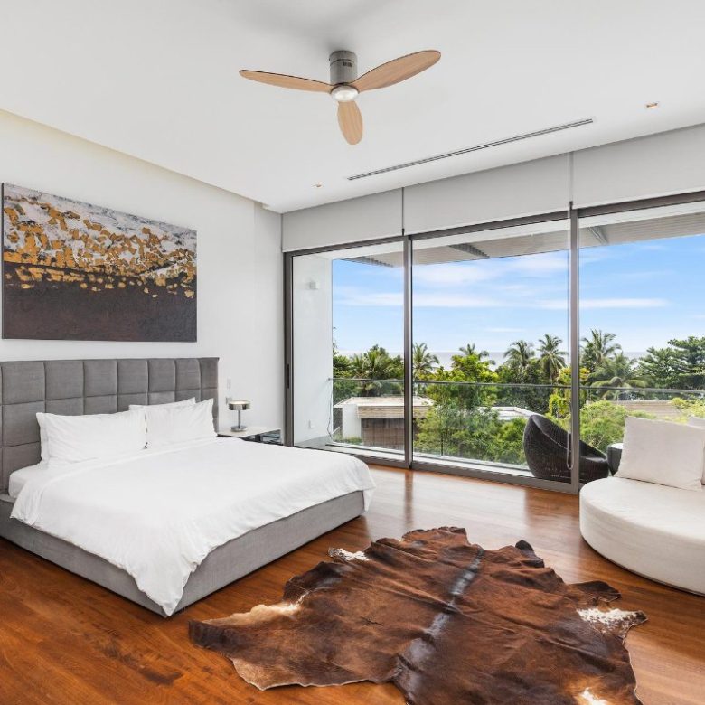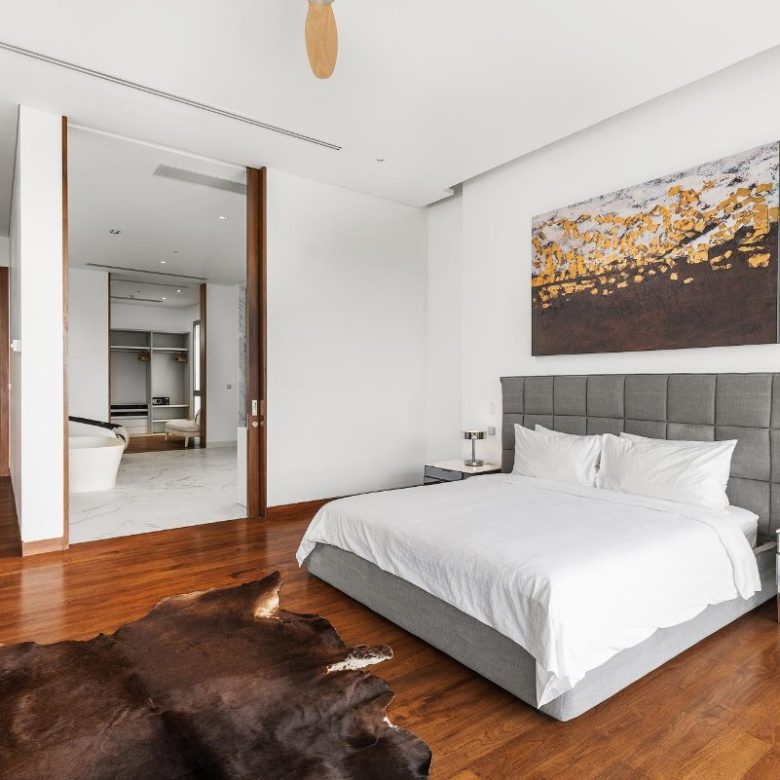 The upper-level master suite features a private balcony with partial sea views, a spacious walk-in dressing area, and an ensuite marble bathroom with a freestanding bathtub for indulgence.