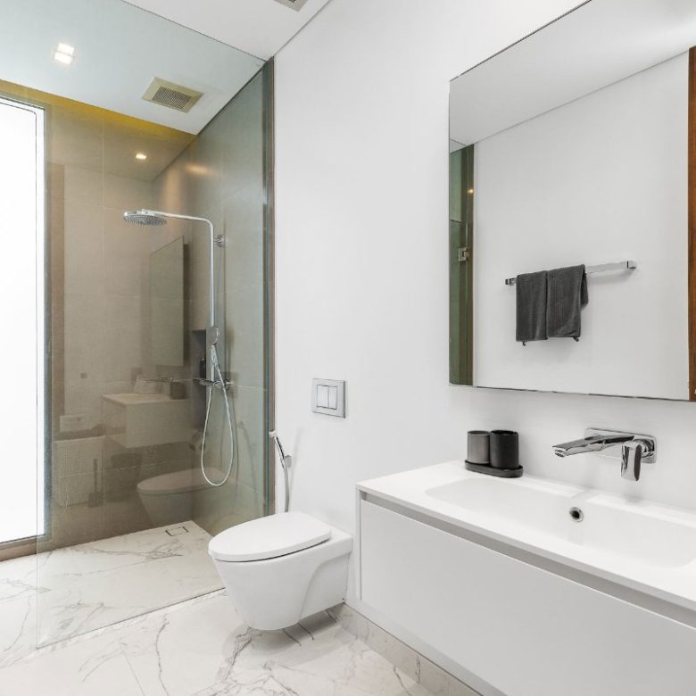 On the ground floor, the multi-purpose room opens directly onto the pool terrace. It can easily transform into a media room, office, or extra bedroom, complete with an ensuite marble bathroom and modern amenities.