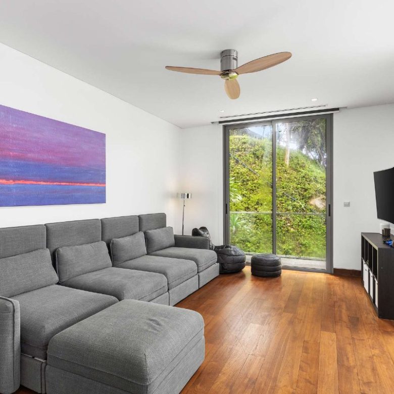 The bright, open living space is the social heart of the home, with glass doors leading to the pool terrace. A sleek, modern kitchen sits behind the dining area, perfect for both casual meals and formal dining. Enjoy tropical garden views from the living area or partial sea views from the upstairs bedrooms.