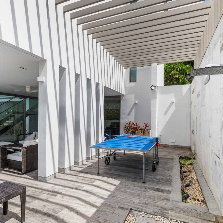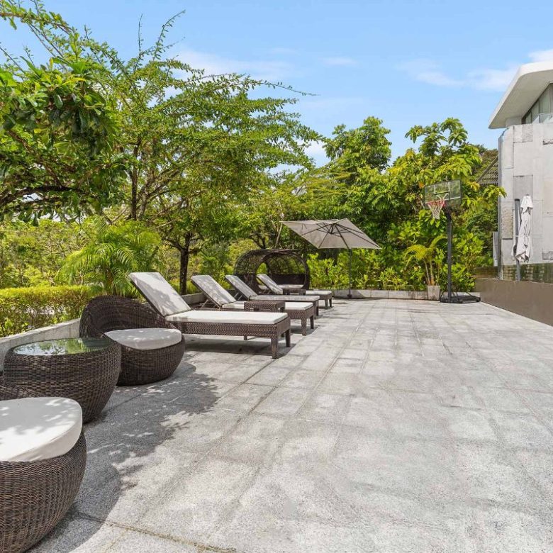 Surrounded by lush greenery, the outdoor spaces are designed for relaxation and leisure. The pool terrace offers peaceful garden views, while the adjacent seating area is ideal for enjoying cocktails at sunset. The extensive patio invites you to lounge or play, with the master suites upstairs offering breathtaking views from their balconies.