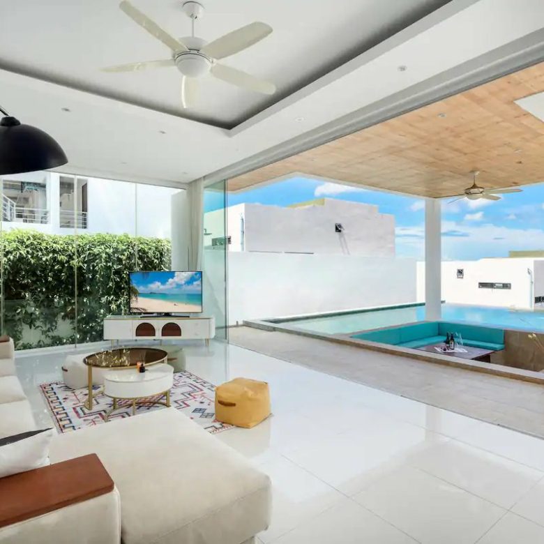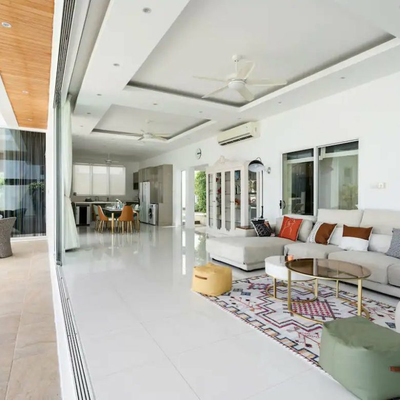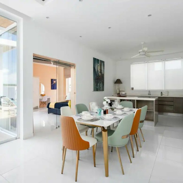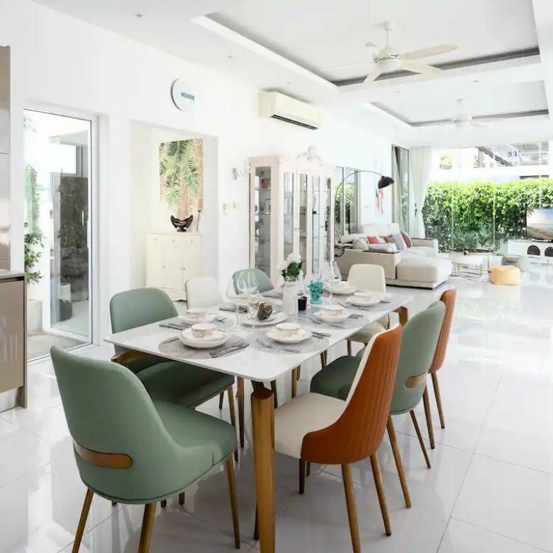 The villa has a wide living space with large sofa and 3 colorful stools to provide more seats in the fun way.