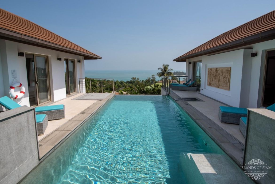 This elevated, luxurious 3 bedroom villa has expansive views overlooking the stunning beach of Choeng Mon which is only 650m away. The main building has an open plan fully equipped kitchen, guest bathroom, large dining area and comfortable living room. A large LED TV with Satellite connection provides entertainment, along with a Blue Ray player and quality music system. Outdoor speakers allow the entertainment to flow onto the pool area you can select from your IPOD, telephone or the radio. All bedrooms are sumptuously furnished, all air conditioned with ensuite bathrooms, the master and one other enjoy the glorious sea views. All rooms lead to the generously proportioned terrace which surrounds the large pool with Jacuzzi. This villa is decorated and furnished to a very high standard which perfectly complements the luxurious setting. There is covered parking in the car port to the side of the villa.