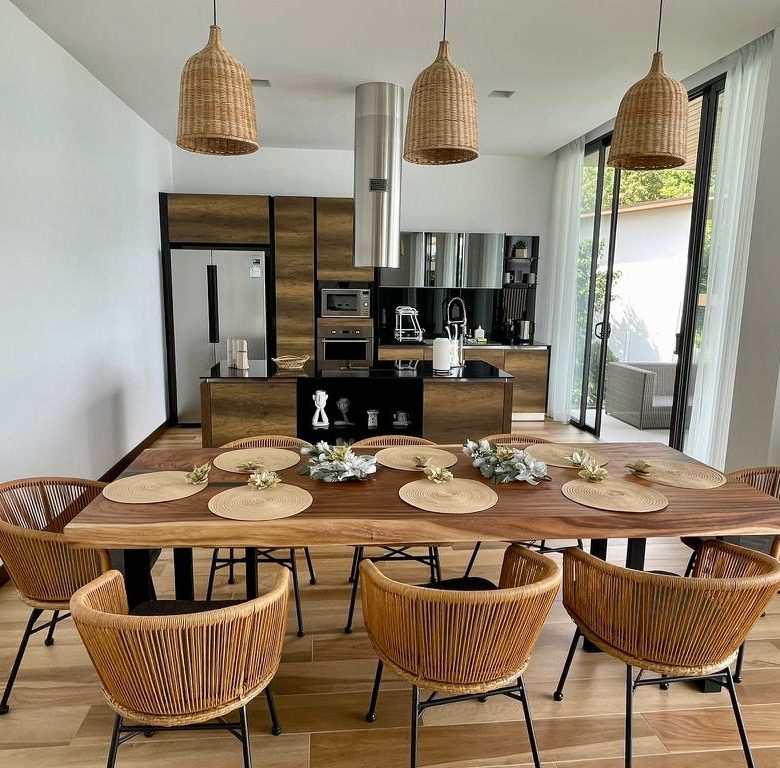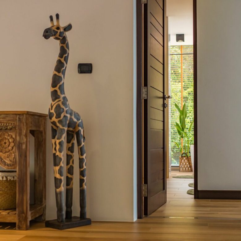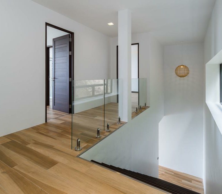 The villa features a two car covered parking garage and an open plan layout and is built on three levels with a small guest room below and the three other bedrooms on top floor above the main bedroom.