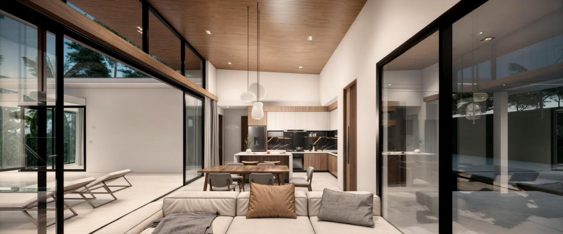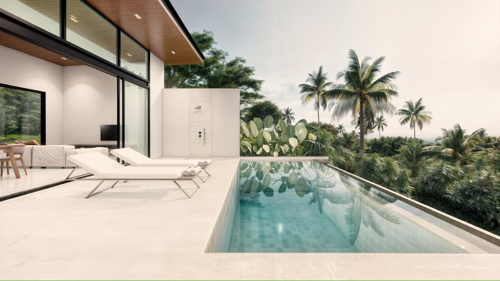 The villas feature 2 bedrooms, 2 bathrooms, a spacious open-plan living area, and a fully fitted kitchen with stylish finishes. Expansive glass walls open onto the terrace and private swimming pool, creating a natural connection to the surrounding greenery.