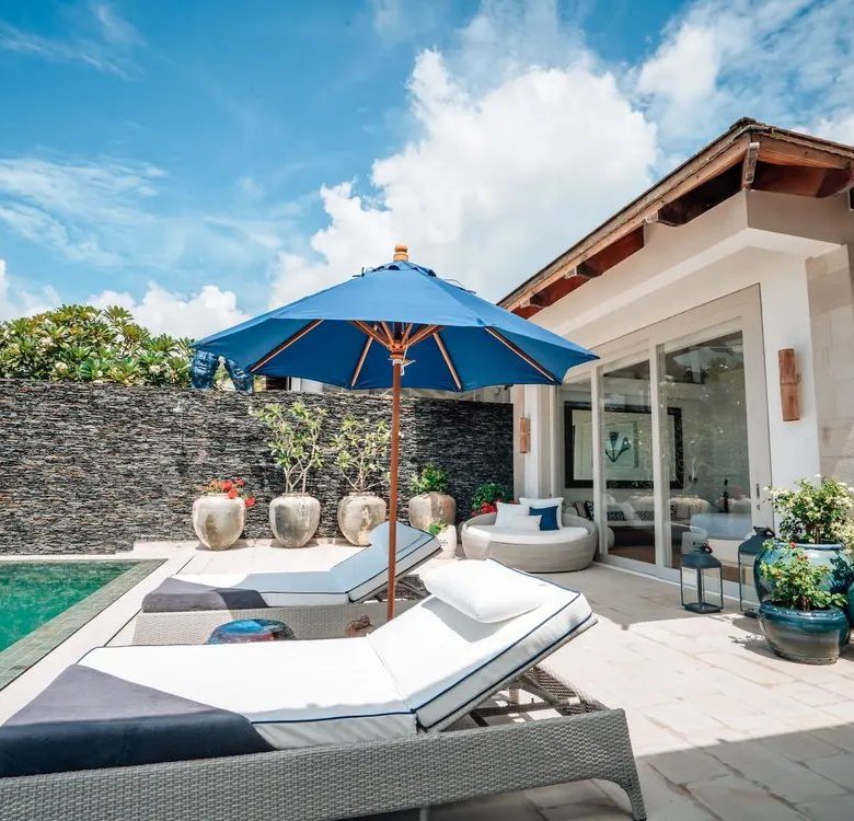 The covered veranda opens onto the 32m lap pool tiled with Balinese green stones and the stunning sea views beyond. The large pool deck offers sun loungers, umbrellas and another high table for meals, games or evening drinks.