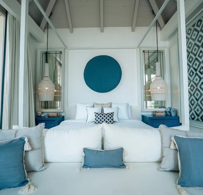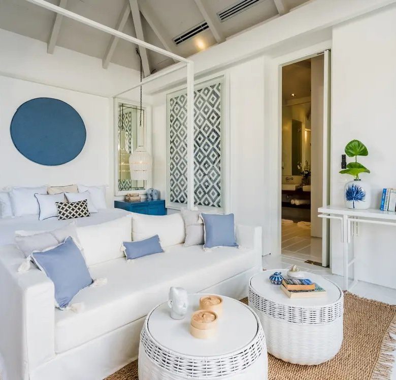 Entering the villa through the large glass doors and greeted by life-sized statues, you can feel the luxurious ambience reflected throughout the property. The spacious open plan living area is dominated by comfortable long white sofas and a dining table for eight. This space blends harmoniously with the covered outdoor lounge and dining area, which also houses a second dining table. The fully equipped kitchen is defined by a floating island. All meals and barbecues are prepared by our team and Thai chef and served in the villa.