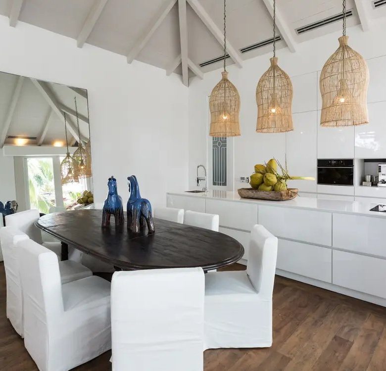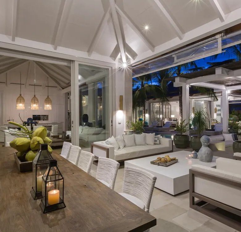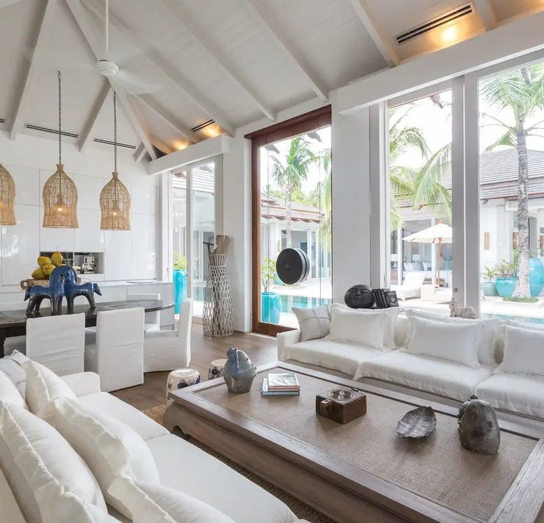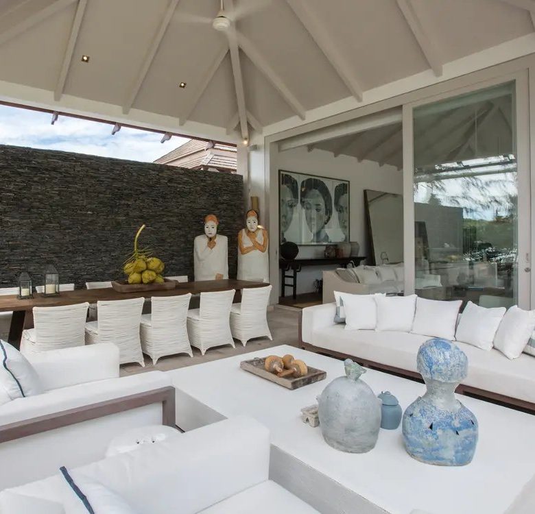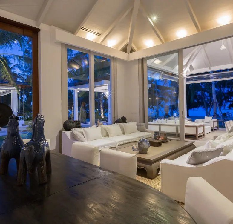 The palatial proportions of this villa include high vaulted wood panelled beamed ceilings. The property is roofed in cedar shingles and all rooms have sliding glass walls leading out onto verandas or the pool deck. The high ceilings are painted white, giving all 5 bedrooms brightness and a clean, modern feel. The property features a cohesive design and the layout is practical and accessible for guests of all ages. The villa is equipped with audio connections so music lovers can enjoy their favourite tunes while partying, relaxing, dining or lounging.
