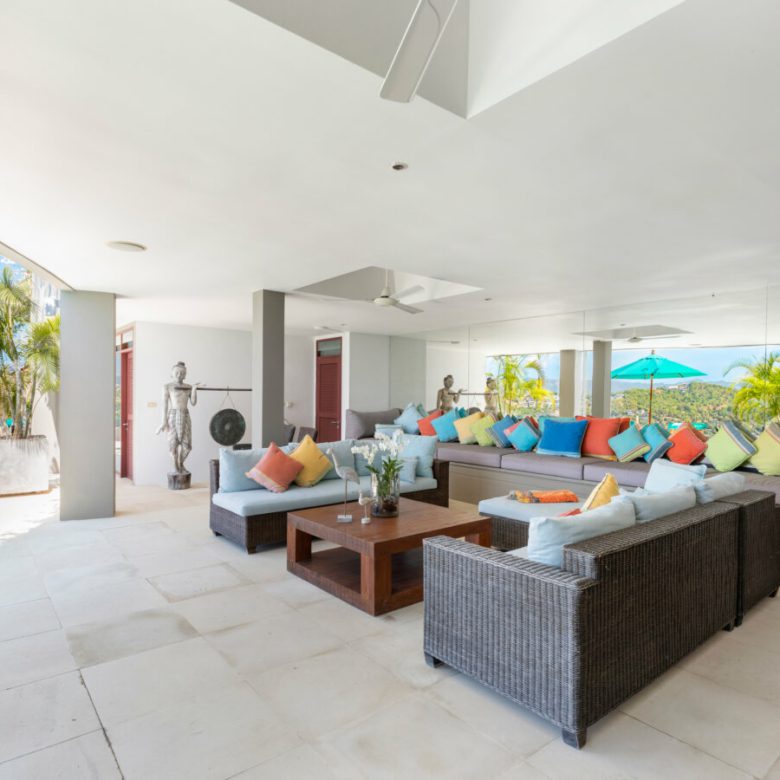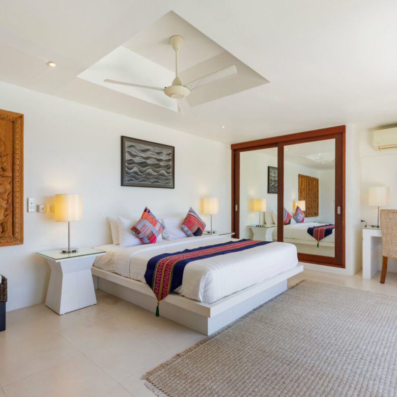 This stunning 5 bedroom hilltop villa has an 180 degree panorama vistas of both sunrise and sunset. You can take in the first light of dawn as the sun rises over Choeng Mon Bay, and then relax with a drink on the spacious terrace at sunset, while enjoying the comfortable alfresco lounge. The tropical and elegant 5 bedrooms offer all ensuite bathrooms for your privacy and full comfort during your stay.