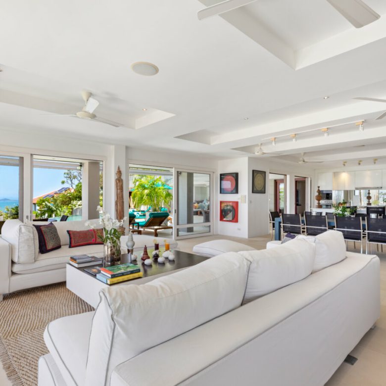 A haven of hilltop peace with truly remarkable 180 degree east to west panoramic views, the villa boasts among the finest sunrise and sunset panoramas in Koh Samui and yet is just a few minutes’ drive from the surrounding beaches with a wide selection of restaurants, bars and 5 star hotels. It is just 10 minutes from the airport, but not on its flight path and 10 minutes from Chaweng and the famous Fisherman’s Village.