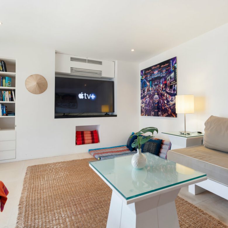 The outdoor spaces provide perfect opportunities to relax. The upper floor has a 107 sqm terrace that wraps around the front of the villa. A discreet guest bathroom, with shower, just off the terrace and all terraces are edged with white bougainvillea. There are ample sun loungers beside the pool and if it gets a bit hot you have an undercover relaxation area with comfortable seating, fans, a coffee table and a ping pong table.