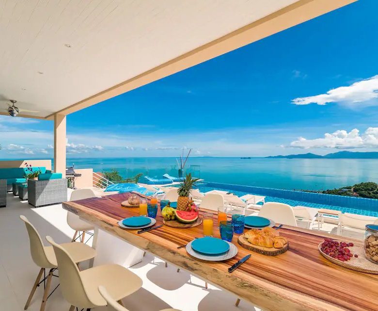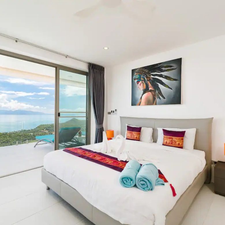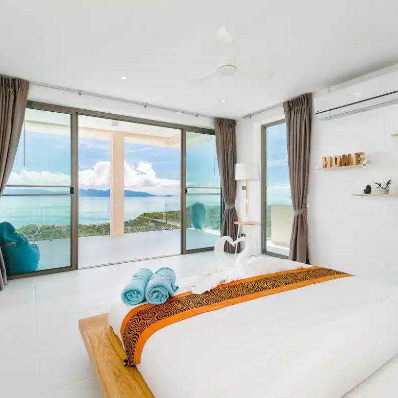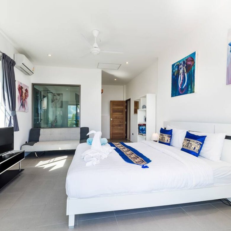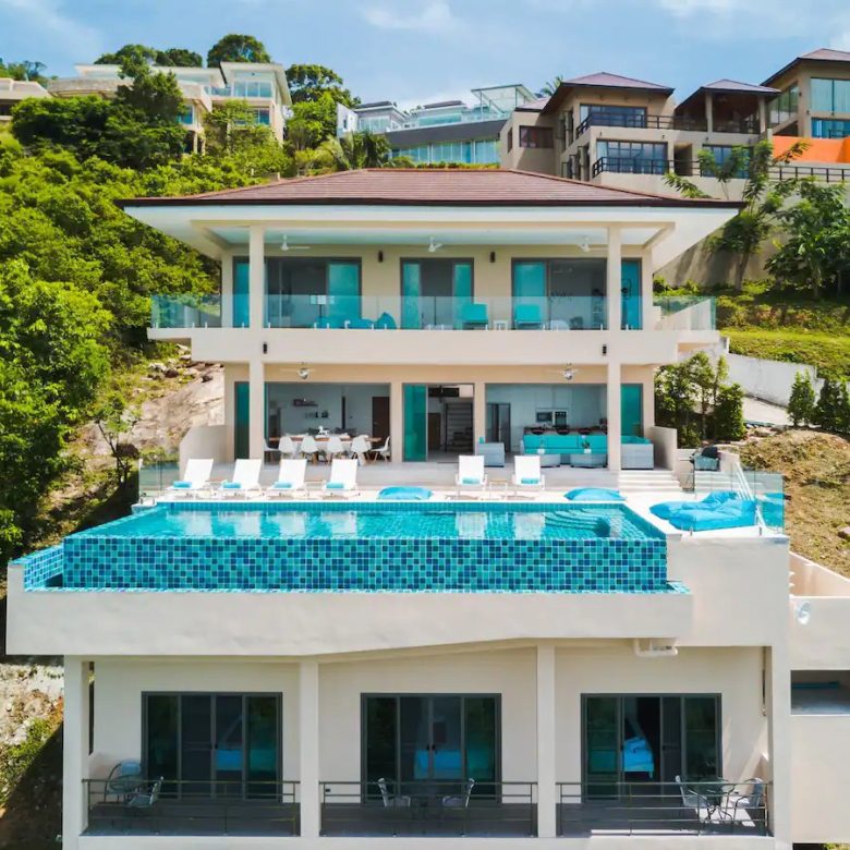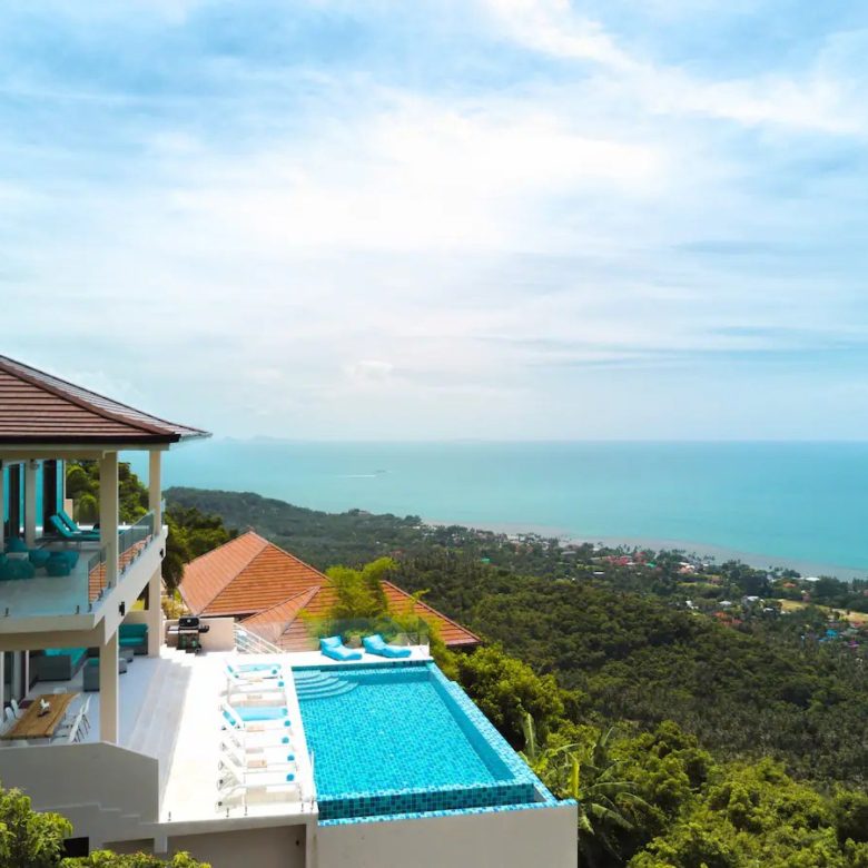 Located in a private and secured residence in the hills of Maenam, just 2 km from the heavenly beaches of Bang Po, the villa features 5 air-conditioned bedrooms with en-suite bathrooms and panoramic sea views, which you can also enjoy while showering in the 2 additional and intimate outdoor showers.