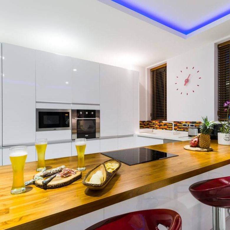 The spacious open plan custom-made kitchen contains all the facilities and a beautiful wooden breakfast bar, overlooking the 10 x 4.5 meter infinity pool that blends its blue colors towards the sea and the sky.