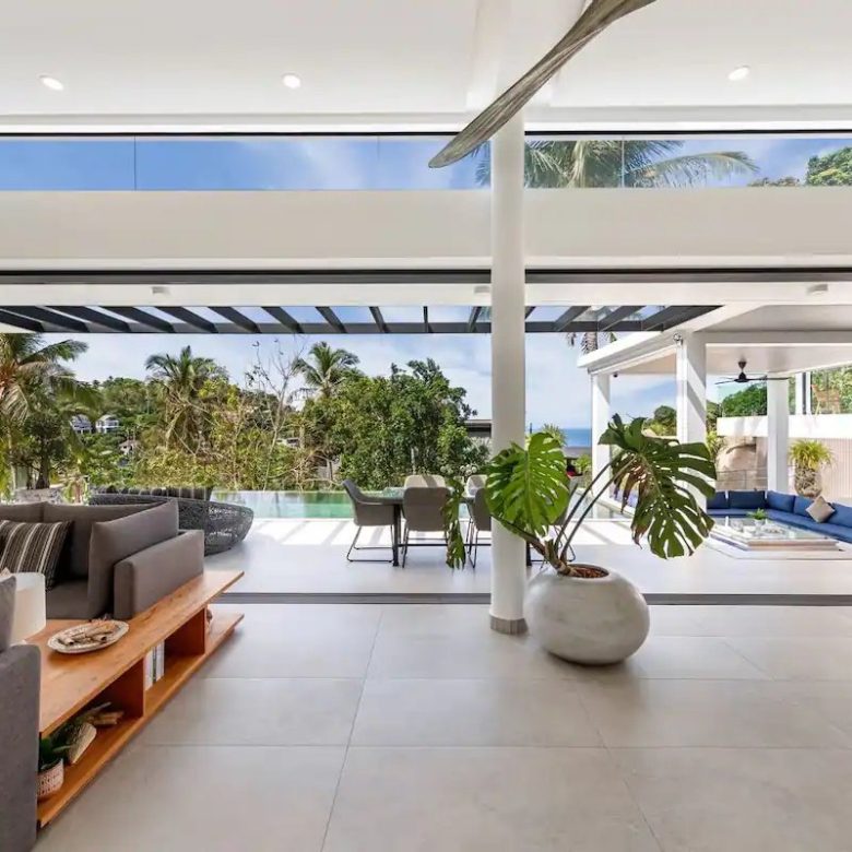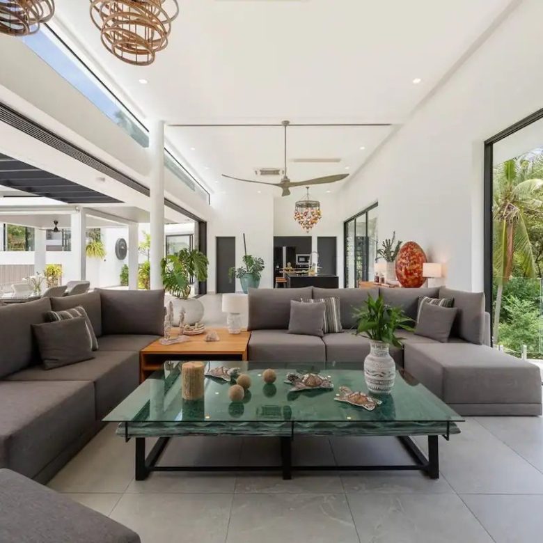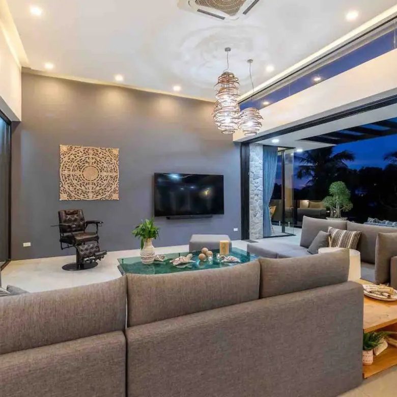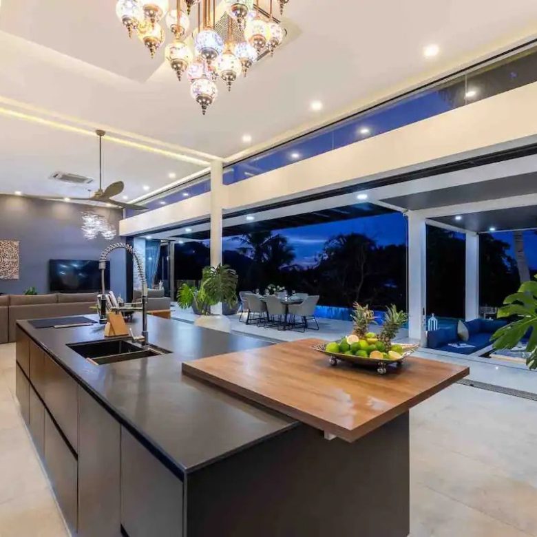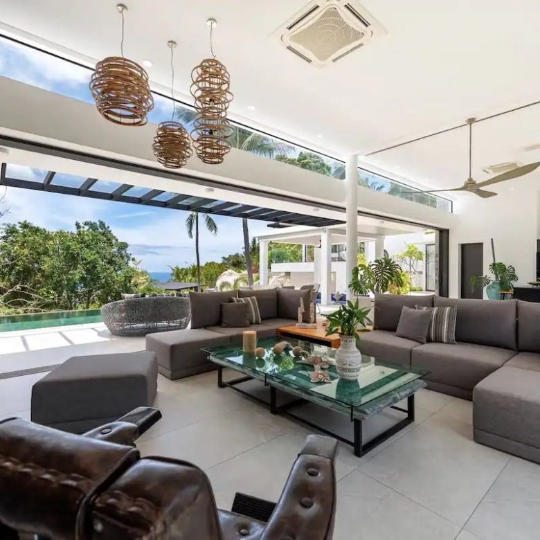 The living room, with natural light, is decorated with exquisite taste. It is the ideal meeting place for relaxing moments with family or friends. Whether you want to enjoy the breathtaking view from the kitchen or relax in the living room, this villa offers a luxurious experience that combines elegance and nature, allowing you to immerse yourself in the paradise of Koh Samui.