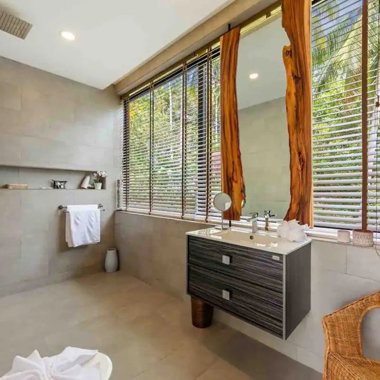 The centerpiece is a stunning infinity pool that seems to merge with the green horizon. The living spaces, both spacious and elegant, are designed to invite relaxation and socializing. The kitchen, with large windows, offers panoramic views of a lush coconut palm and jungle landscape. It is the ideal place to prepare meals while being inspired by the natural beauty around you.