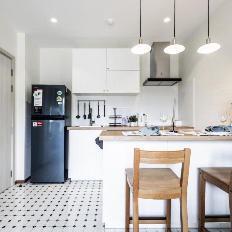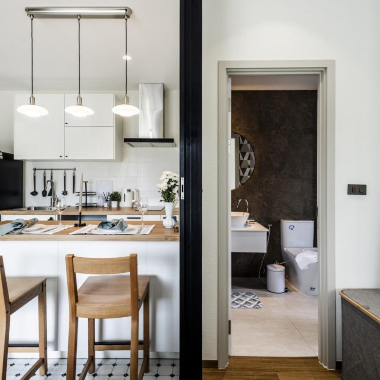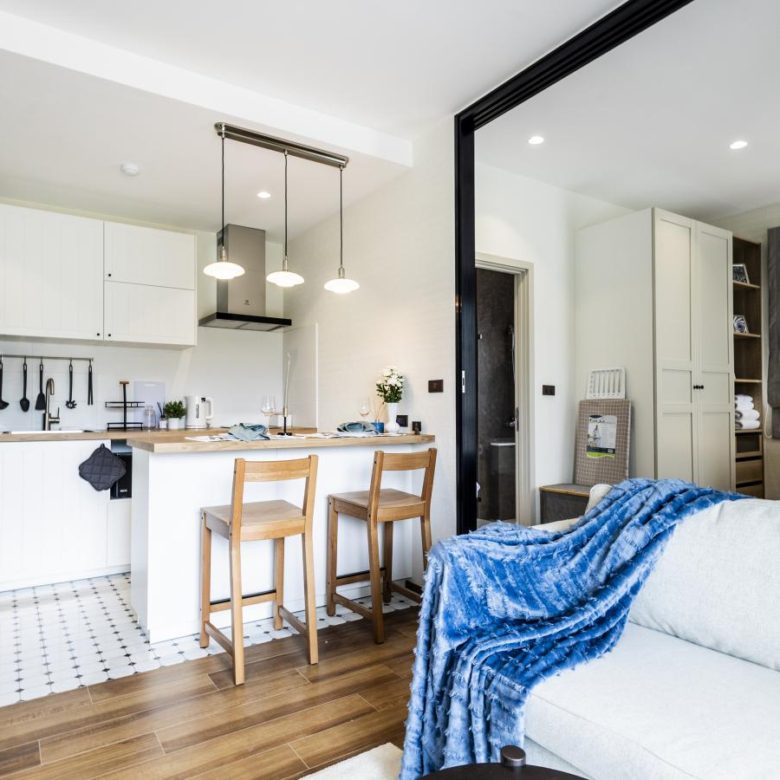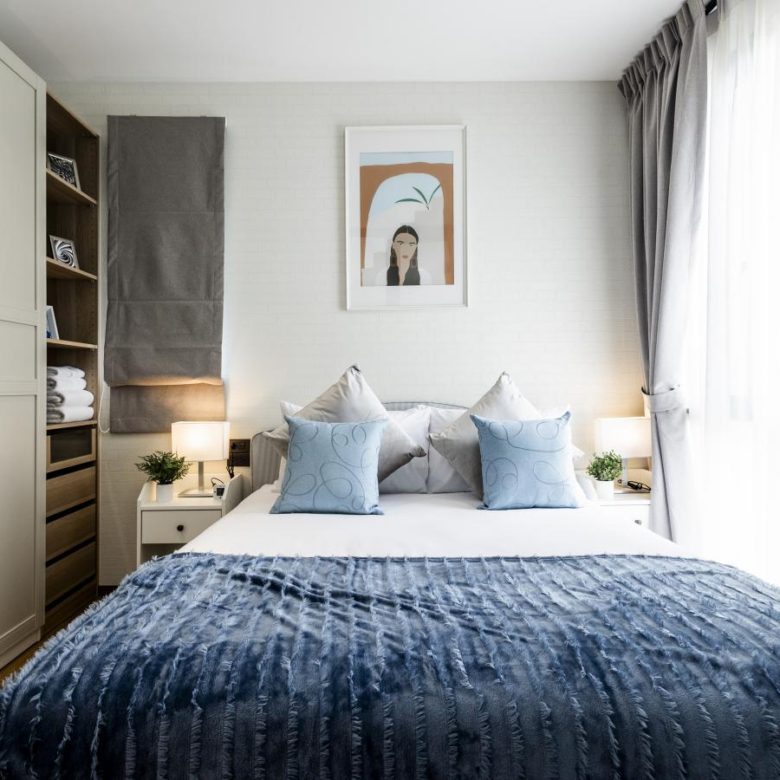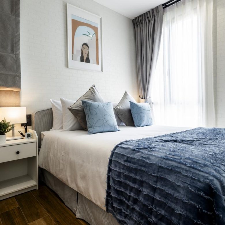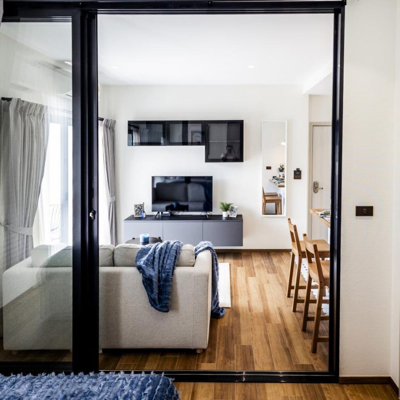 1-Bedroom: 36 sqm, with a glass partition and blackout curtains separating the bedroom and living room