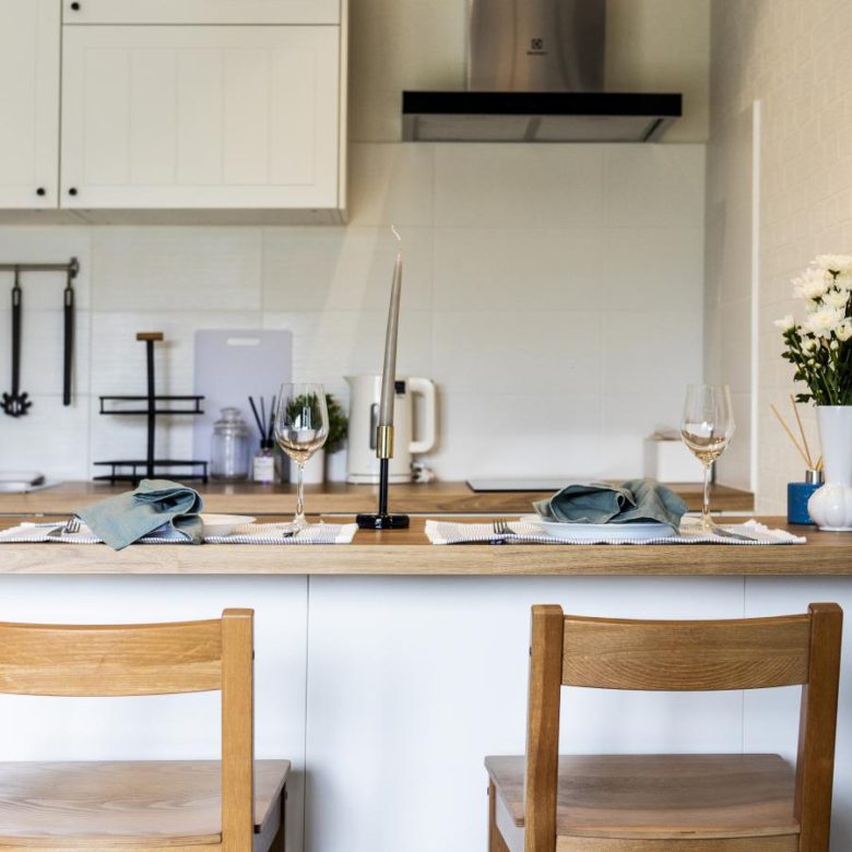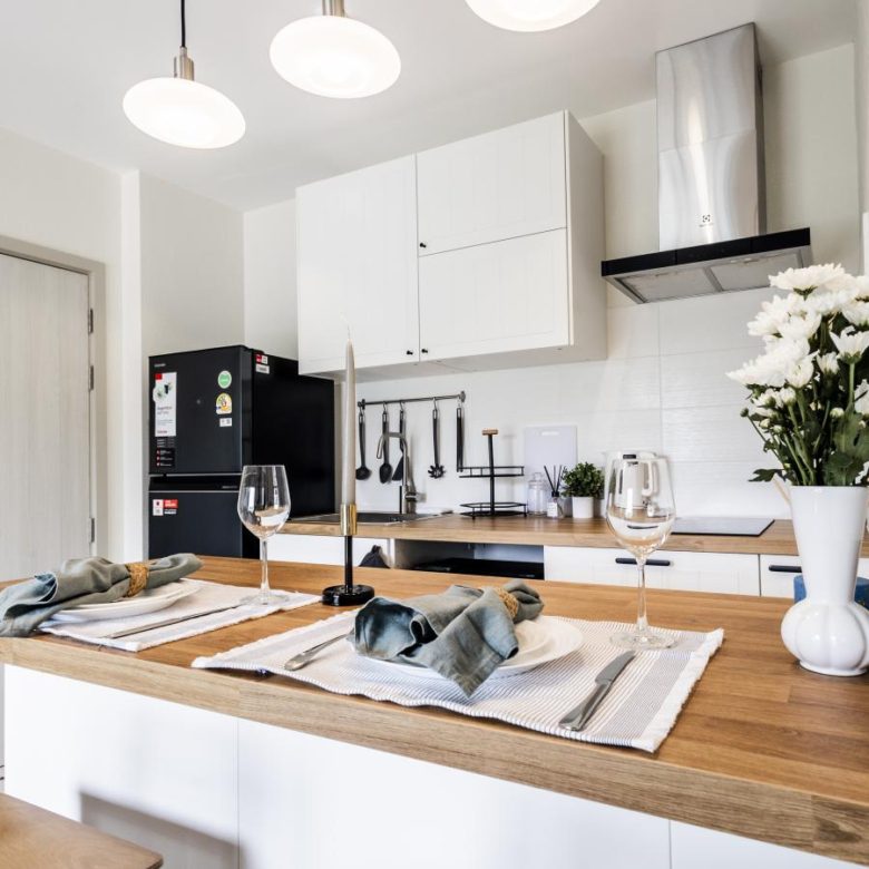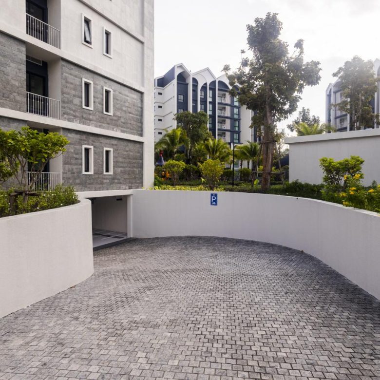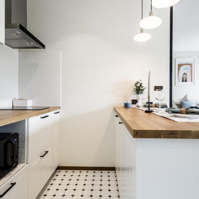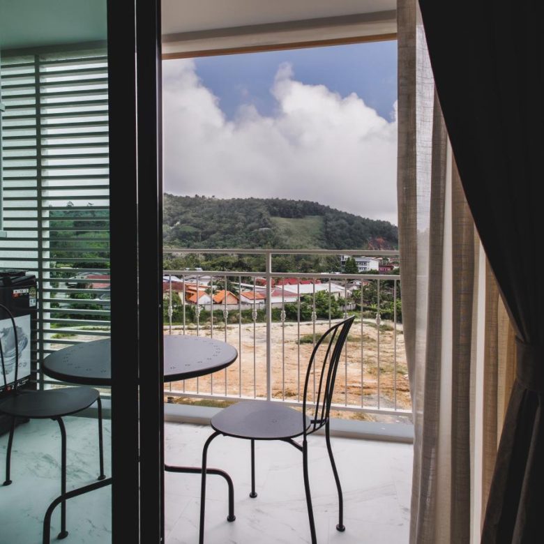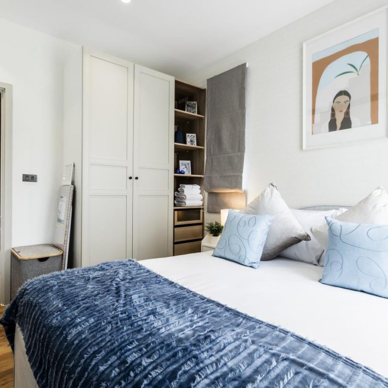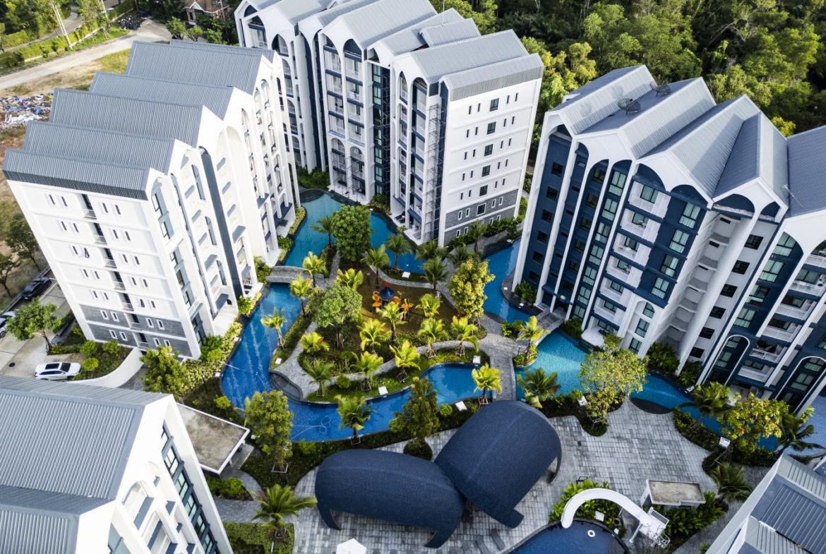 1-Bedroom: 36 sqm, with a glass partition and blackout curtains separating the bedroom and living room