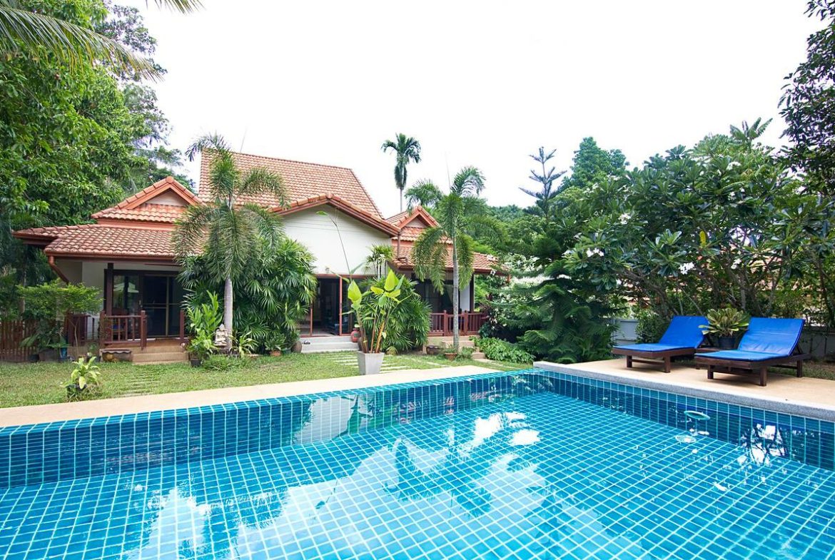 The 200 sqm house is airy and spacious, with wooden floors and Thai modern furniture that adds to its charm. The two ground floor bedrooms open onto terraces with stunning views of the pool and garden, while the upstairs bedroom terrace overlooks an adjacent eucalyptus plantation.
