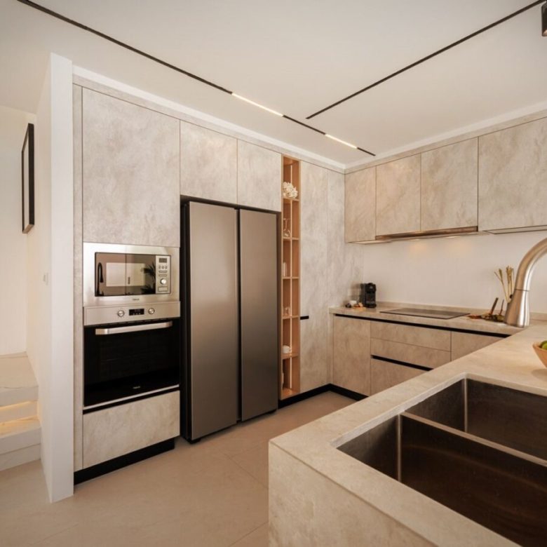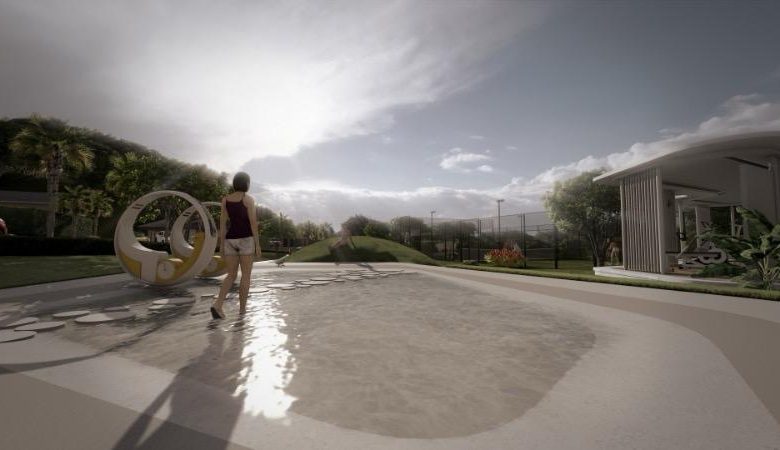 including its outdoor space, features a layered design with a lively courtyard on the first floor, featuring a private swimming pool, water features and lush greenery.
