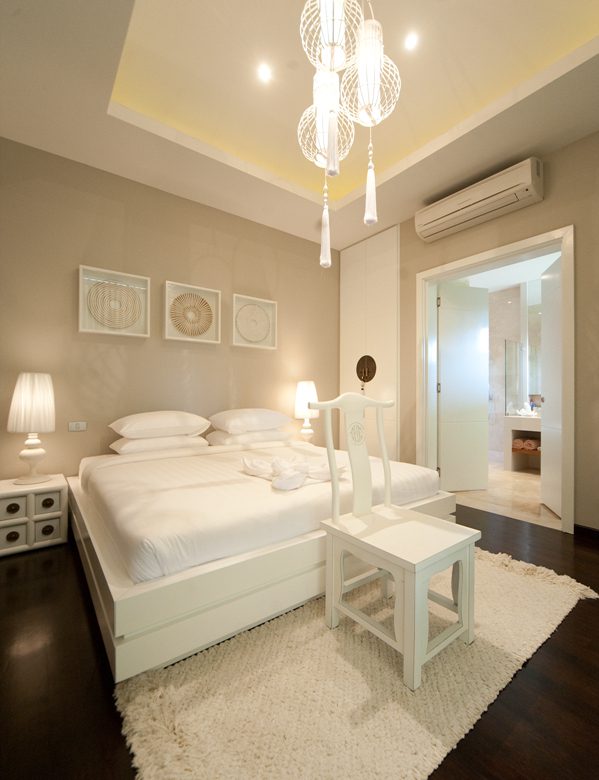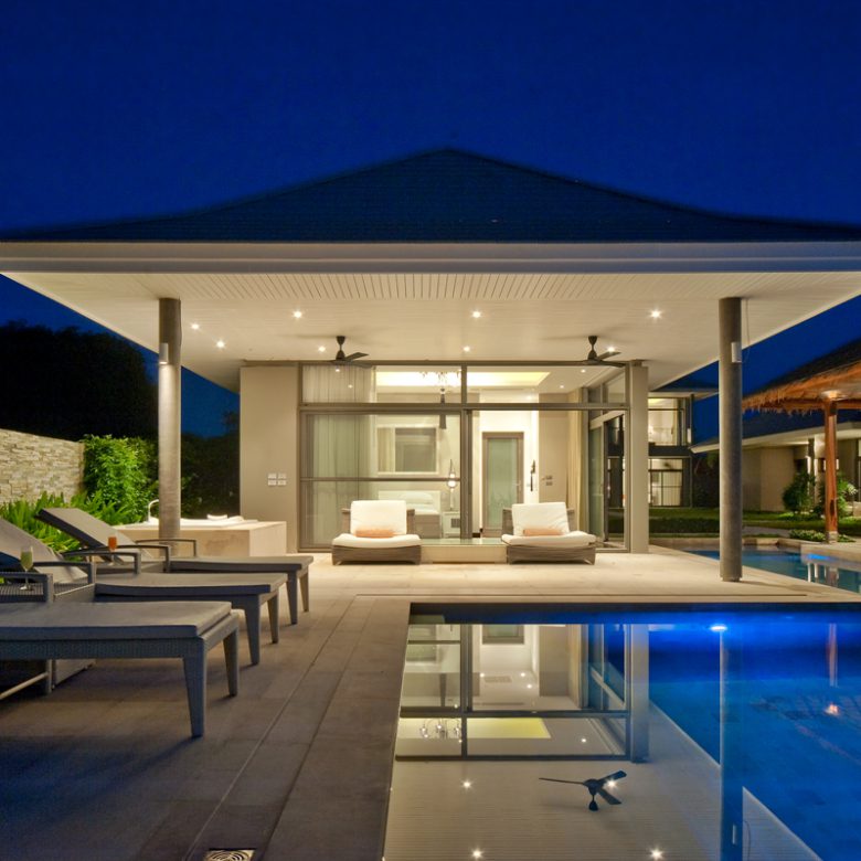 The villa is divided into a main building and separate pavilions that house 6 bedrooms , 8 bathrooms , a sunken gazebo with an infinity edge , a diving pavillion, a kitchen and staff quarters.
