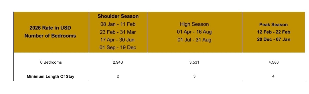 Samujana Villa 10 has recently undergone extensive renovations and features 6 very large private en-suite bedrooms as well as a plethora of social spaces. The villa is an entertainer’s dream with air-conditioned lounge and dining area opening up onto an expansive pool deck with spectacular views of our coral cove. A walled garden area is perfect for family picnics and the large infinity-edge pool is the star of the show. Centrally located on the estate, Villa 10 is a delightful walk down to the beach and overlooks the Samujana tennis court. The Master Bedroom, perched on top of the villa, commands the best views and features a walk-in closet, designer bathroom and private sun deck.