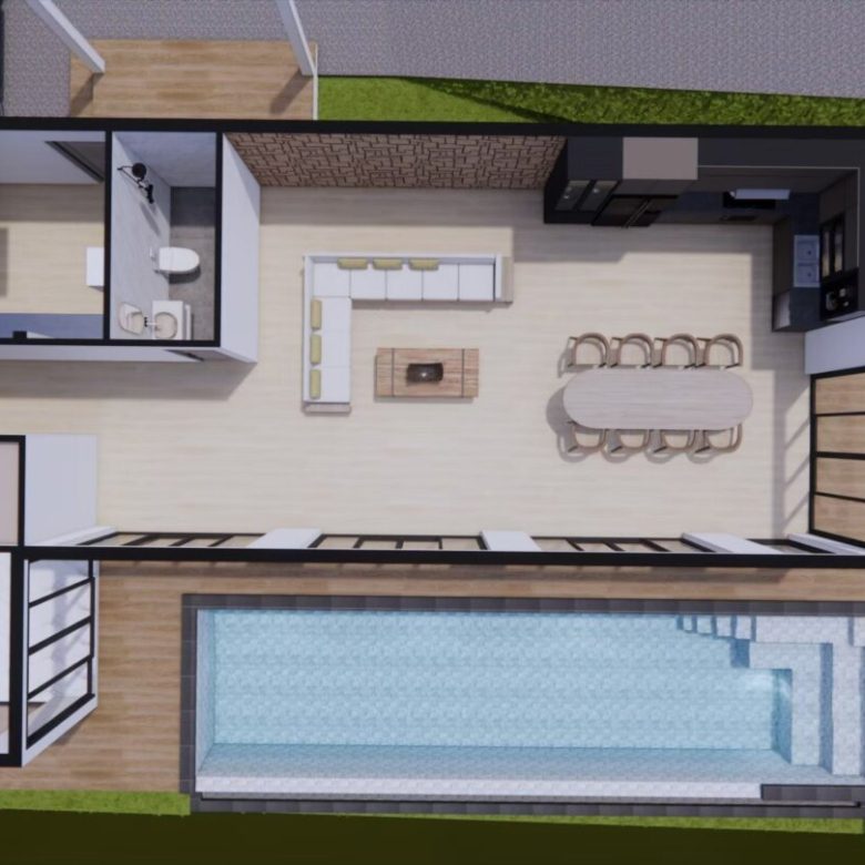 indoor and outdoor spaces. The private pool area, framed by an elegant deck,