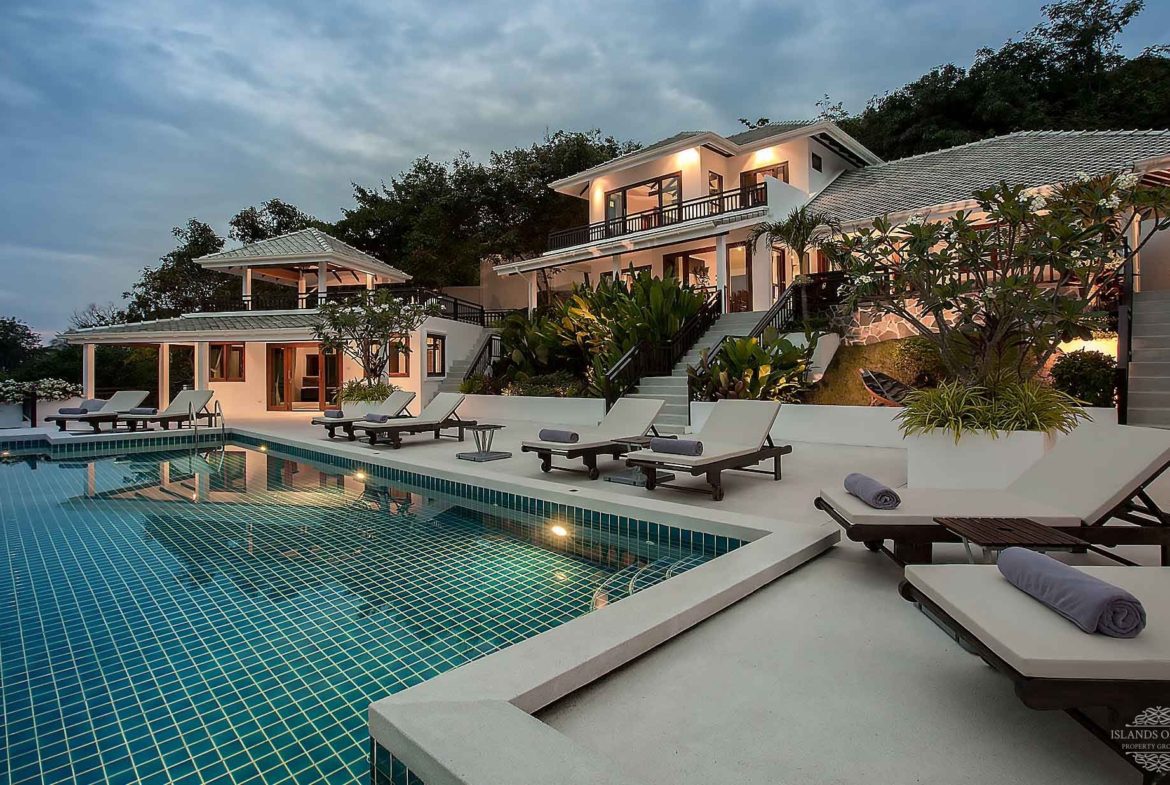 Secret Beach Villa is a 6-bedroom villa that overlooks the secluded and pristine Haad Thong Lang Beach on Koh Phangan. It can accommodate 8 adults and 4 kids. As there are no other properties built directly onto this bay, guests are afforded an essentially private beach which can be reached by taking a few steps down from the villa. This rare location offers abundant sweeping tropical views over the beach, bay, and neighboring Ko Ma island. As the villa is separated over a few levels, ample unobstructed light streams through the large windows, of which there are many. The interiors are clean and modern, including traditional Thai elements and wood to soften the overall look. The main living and dining space has white walls and white vaulted ceilings, set against beautiful wooden trusses – the result is a seamless blend of class and character.