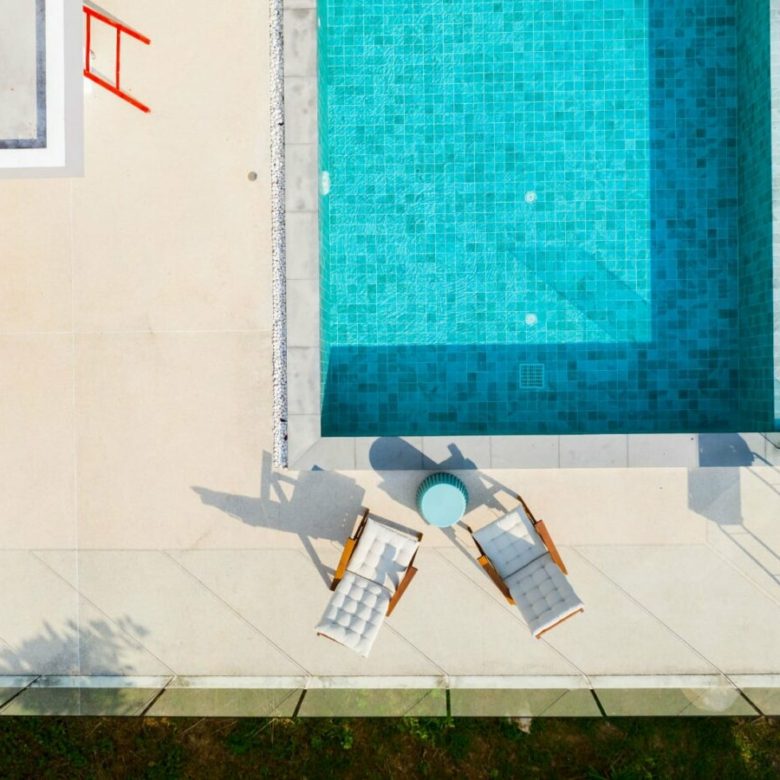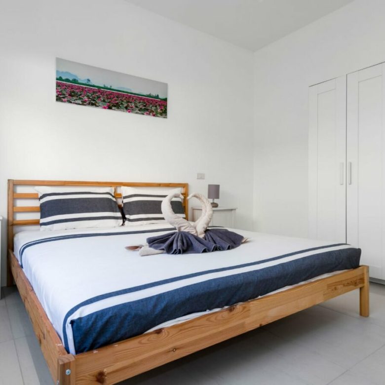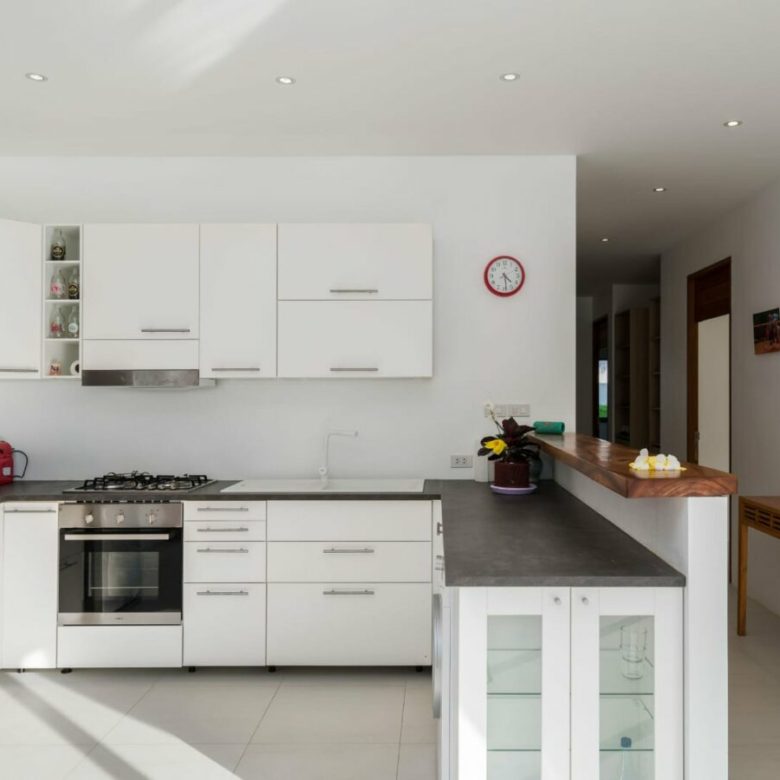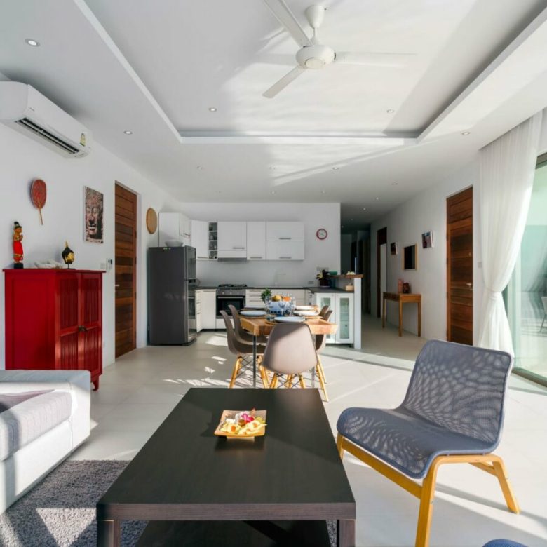 The villas have 3 bedrooms and two bathrooms. Another room can also be used as a baby’s bedroom, playroom or even an office. You can arrange it however you like. The living space, as well as the open fitted kitchen, gives direct access to the terrace.