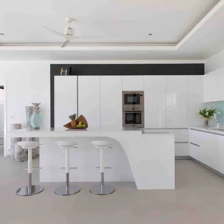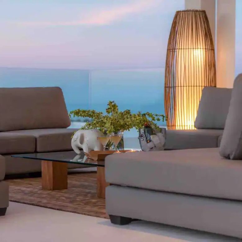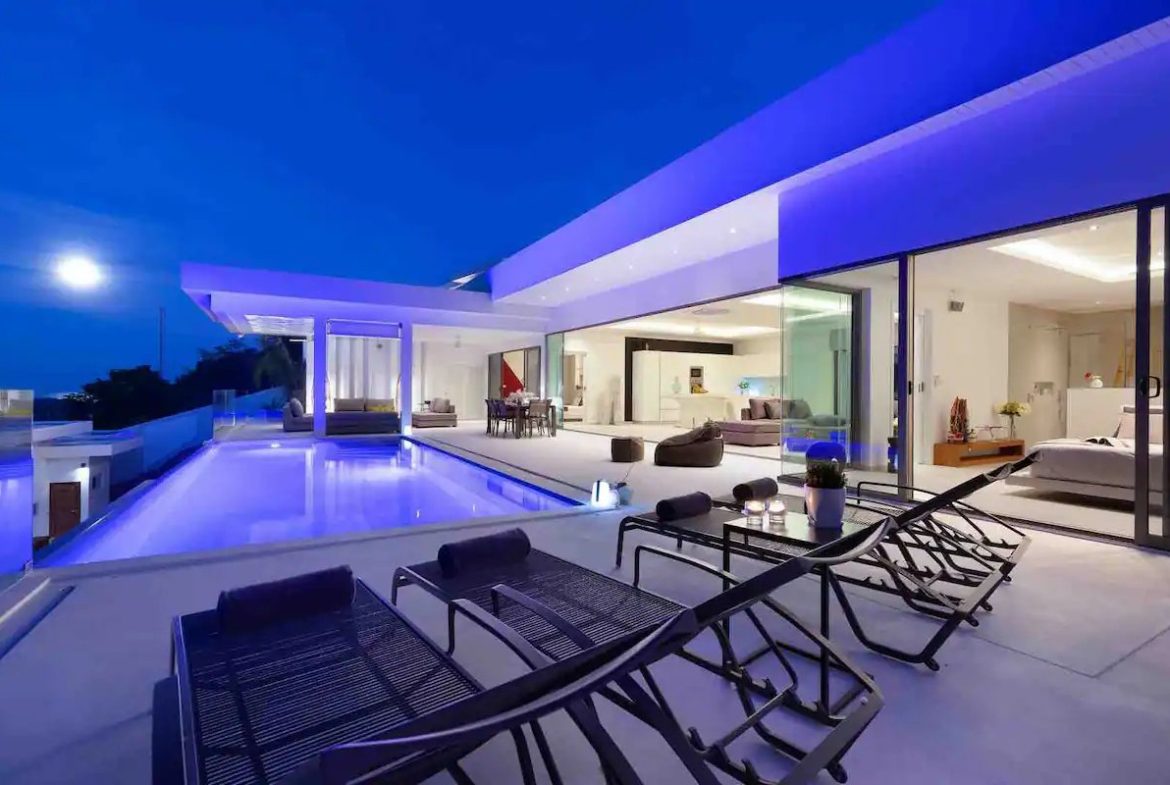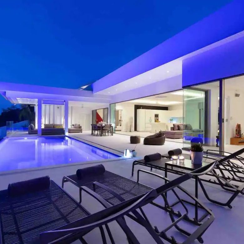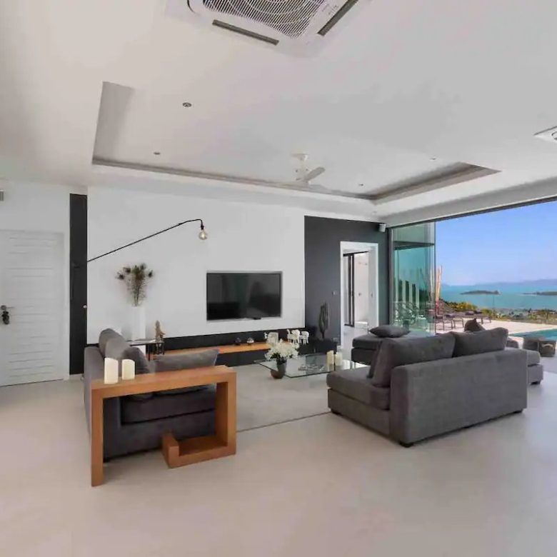 The grandeur of our villa is evident as you enter the expansive living space that blends harmoniously with an impressive 16mx5m infinity pool. This cozy space features a sophisticated living room with a high-end TV and Sonos audio system that blends perfectly with the fully equipped open-plan kitchen.