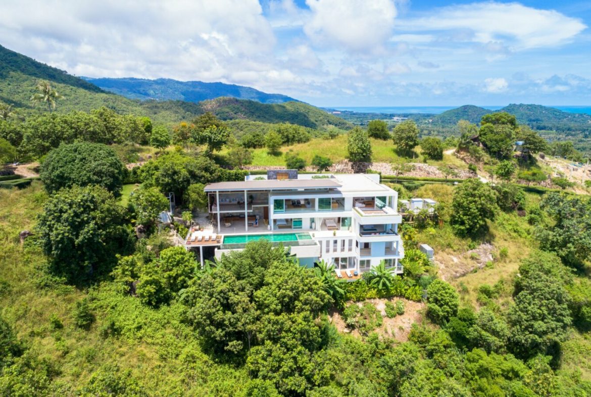 Located in the highly exclusive Sahn Kiri Khan development , Villa Six Red Fish is a majestic home that faces out onto the South coast of Samui and the villas floor to ceiling windows frame an unforgettable vista of Koh Taen which dominates the view , Koh Matsum , Koh Wang Noi and the rolling mountains of Khanom and Donsak on the mainland .