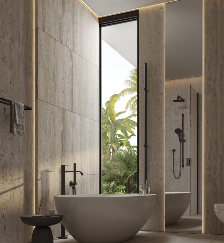 The concept is imbued with modern architecture and design, with stunning views of the mountains and partly of the sea directly from the villa.