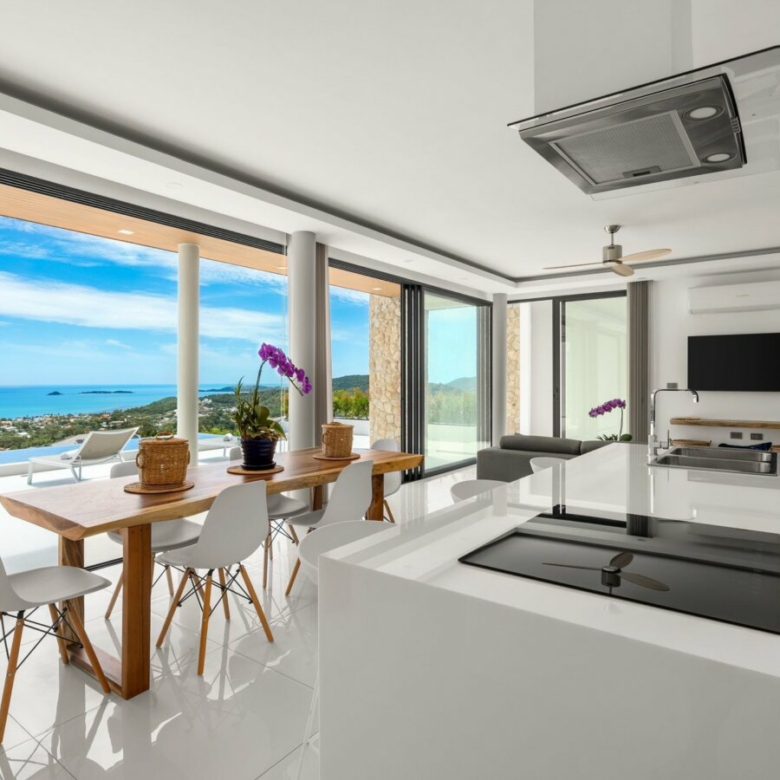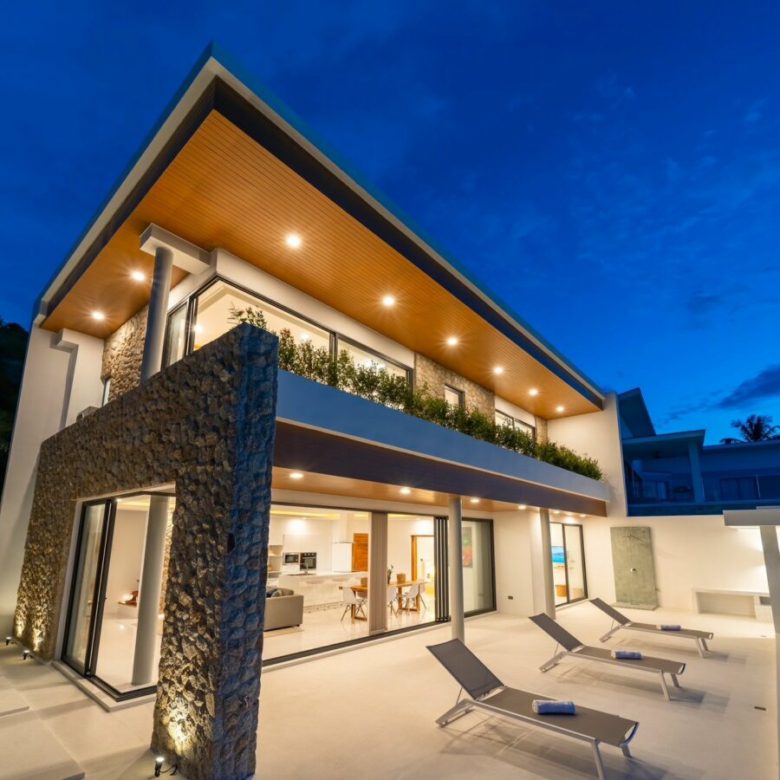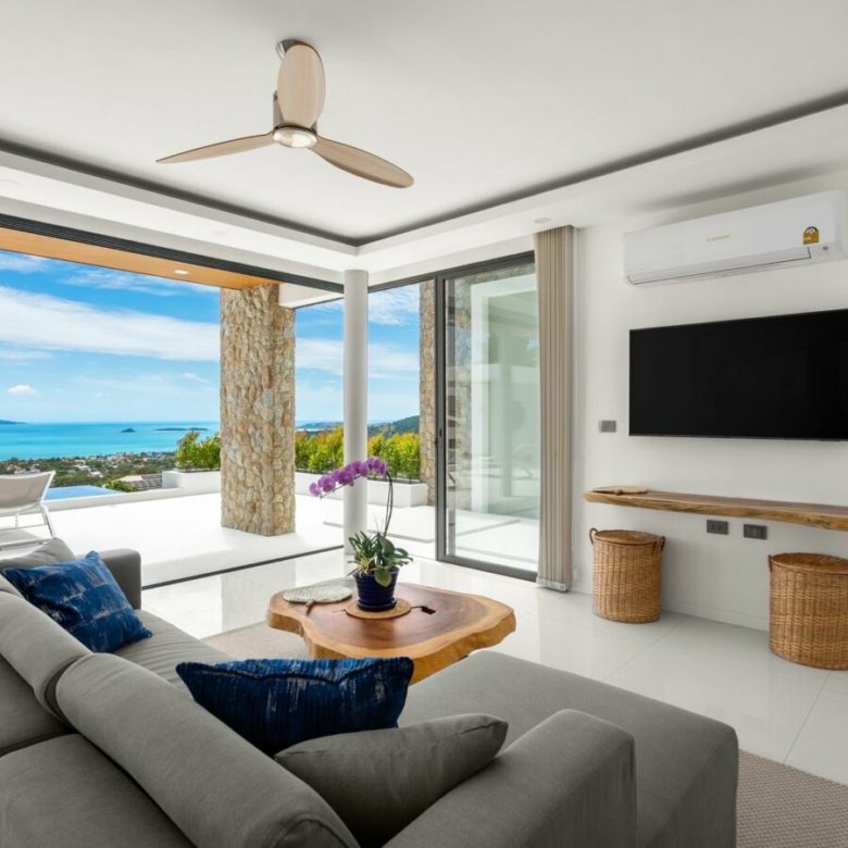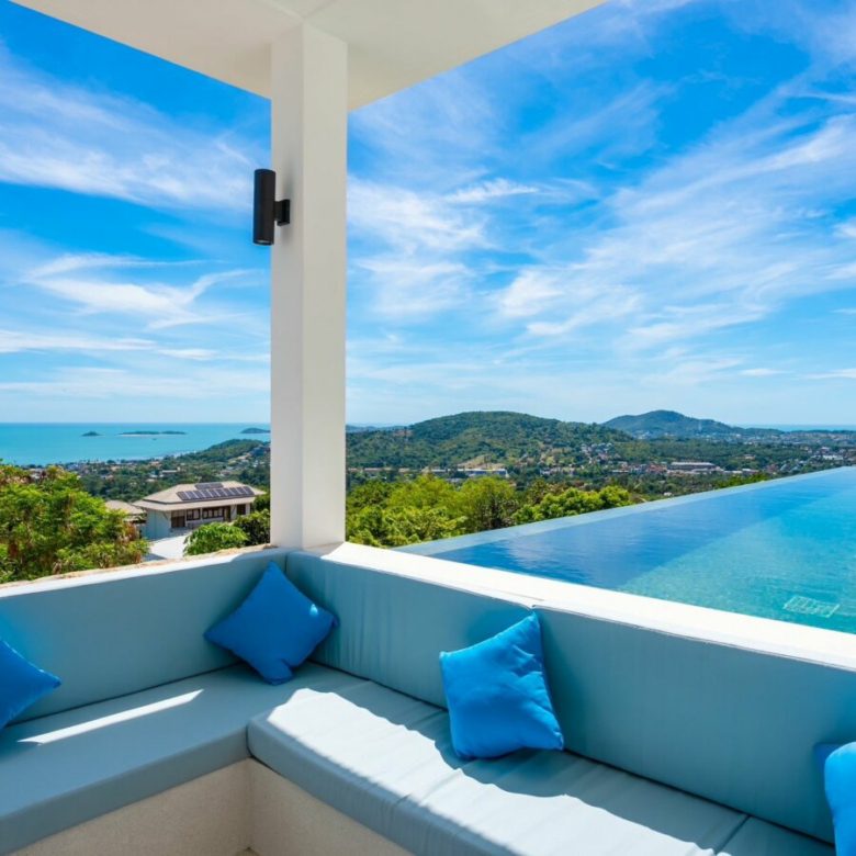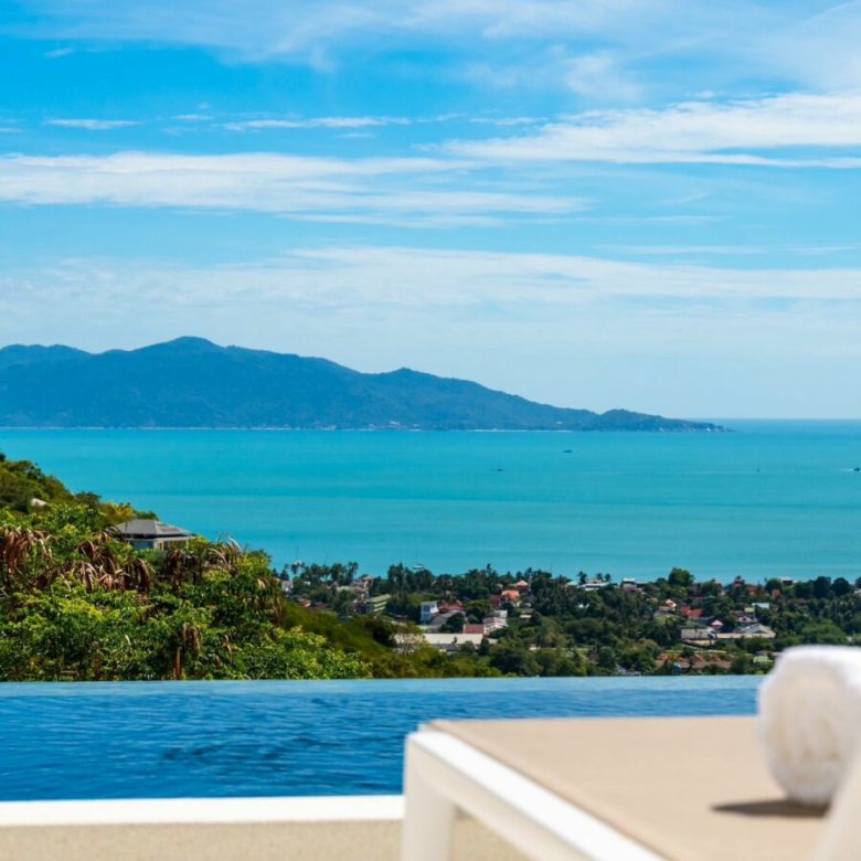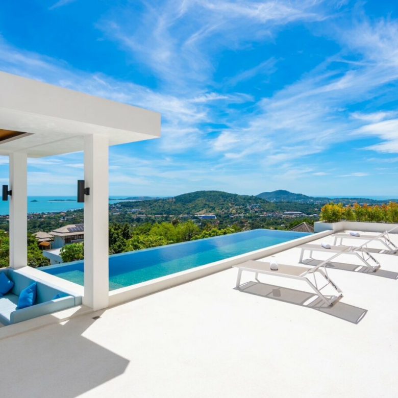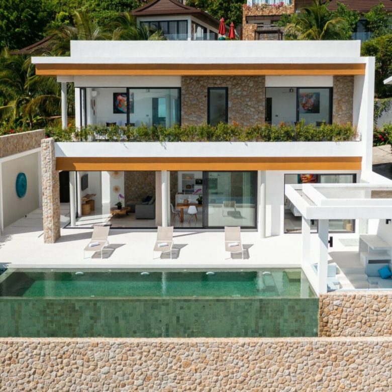 Splendid villa of 245.90 sqm, including 99.80 sqm of terrace, in the heights of Bophut with a magnificent sea view, built on a plot of 495.92 sqm. To access the villa, you will take a magnificent custom-made Balinese entrance door as well as an entrance of 24.60 sqm. This villa is made up of 3 bedrooms and each has its own bathroom with shower, toilet, double sink and mirror. There is also a corian bathtub in the master bedroom. They are all equipped with silent dual-motor fans from the Mr. Ken brand, which are found in particular in 5-star hotels, wardrobes and two of them are also equipped with a TV. Thanks to its large bay windows, the living area with living room, dining room and open kitchen, equipped with quality appliances, is very bright because it lets in natural light which illuminates it wonderfully. Enjoy the outdoors and the sea view with a very large 79.80 sqm terrace including its 30 sqm infinity pool, a 9 sqm sala and its 134.07 sqm garden. The coffee table, the dining table, as well as all the shelves of the villa are in Acacia and made to measure. The stairs are also in Acacia with Balinese finishes. The bathrooms, the outdoor shower and the swimming pool are tiled in natural stone from Bali. All the switches in the villa are tactile and from the Gracia brand. Premium white sandwash exterior coating does not heat up with the sun. You can therefore walk around barefoot in complete peace of mind without any fear of overheating or burning. Installation of the 5 kilowatt solar panel system without the batteries. A parking space at the bottom of the villa as well as an additional space before accessing the villa which can contain 3 cars and scooters. The location of the villa is a few minutes drive from the beaches and restaurants, including Fisherman’s Village. You will also be only 8 minutes’ drive from Makro and Big C Super center, 18 minutes’ drive from the airport and 15 minutes’ drive from Big Buddha. Villa sold with Thai company.