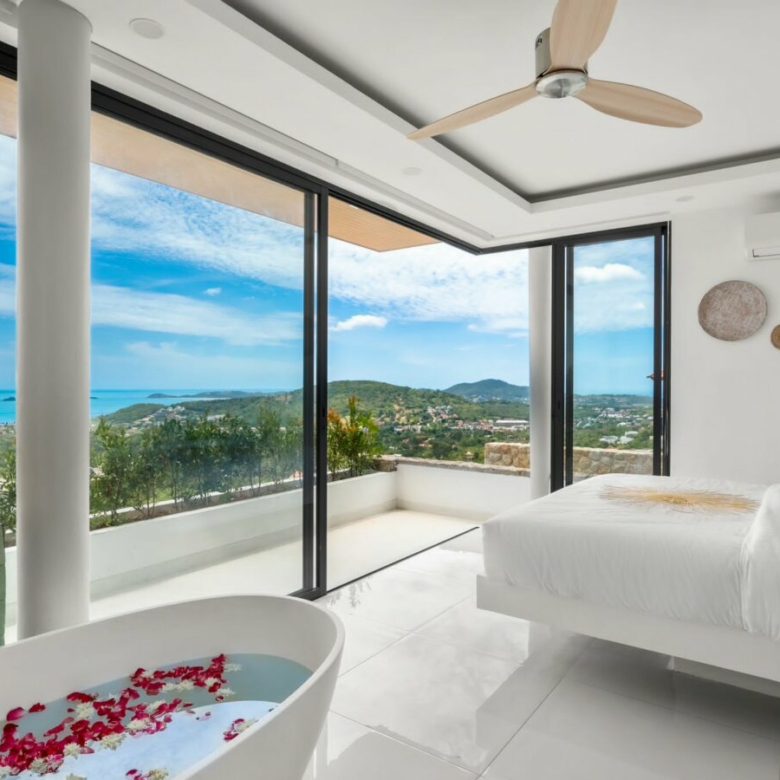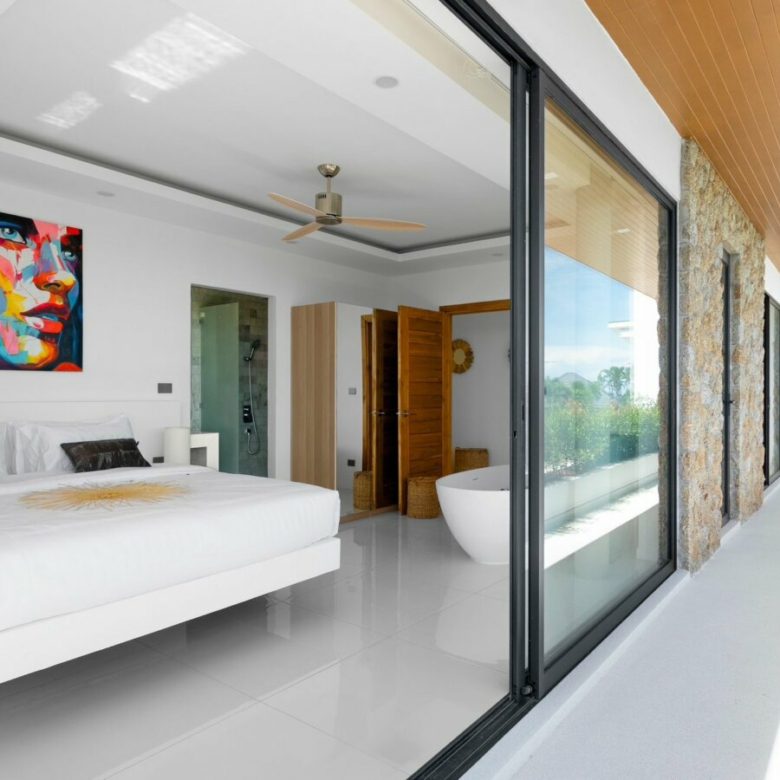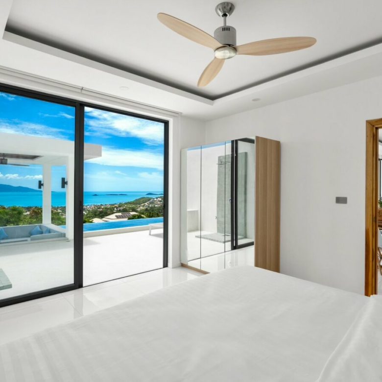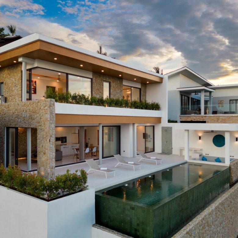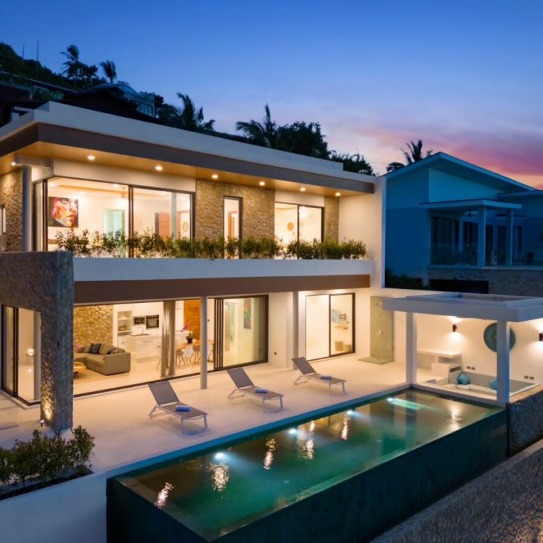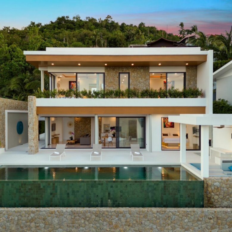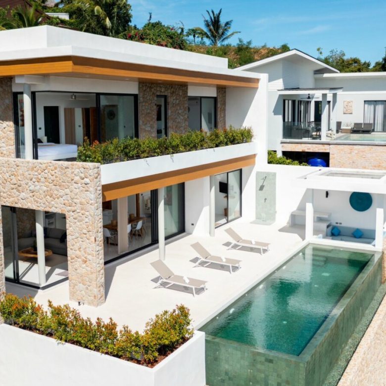 Splendid villa of 245.90 sqm, including 99.80 sqm of terrace, in the heights of Bophut with a magnificent sea view, built on a plot of 495.92 sqm. To access the villa, you will take a magnificent custom-made Balinese entrance door as well as an entrance of 24.60 sqm. This villa is made up of 3 bedrooms and each has its own bathroom with shower, toilet, double sink and mirror. There is also a corian bathtub in the master bedroom. They are all equipped with silent dual-motor fans from the Mr. Ken brand, which are found in particular in 5-star hotels, wardrobes and two of them are also equipped with a TV. Thanks to its large bay windows, the living area with living room, dining room and open kitchen, equipped with quality appliances, is very bright because it lets in natural light which illuminates it wonderfully. Enjoy the outdoors and the sea view with a very large 79.80 sqm terrace including its 30 sqm infinity pool, a 9 sqm sala and its 134.07 sqm garden. The coffee table, the dining table, as well as all the shelves of the villa are in Acacia and made to measure. The stairs are also in Acacia with Balinese finishes. The bathrooms, the outdoor shower and the swimming pool are tiled in natural stone from Bali. All the switches in the villa are tactile and from the Gracia brand. Premium white sandwash exterior coating does not heat up with the sun. You can therefore walk around barefoot in complete peace of mind without any fear of overheating or burning. Installation of the 5 kilowatt solar panel system without the batteries. A parking space at the bottom of the villa as well as an additional space before accessing the villa which can contain 3 cars and scooters. The location of the villa is a few minutes drive from the beaches and restaurants, including Fisherman’s Village. You will also be only 8 minutes’ drive from Makro and Big C Super center, 18 minutes’ drive from the airport and 15 minutes’ drive from Big Buddha. Villa sold with Thai company.