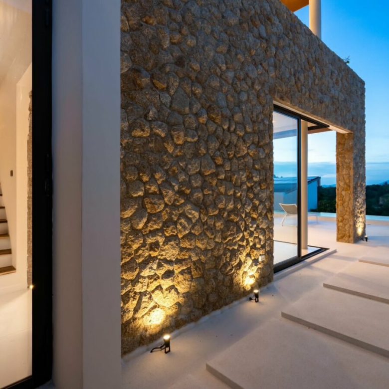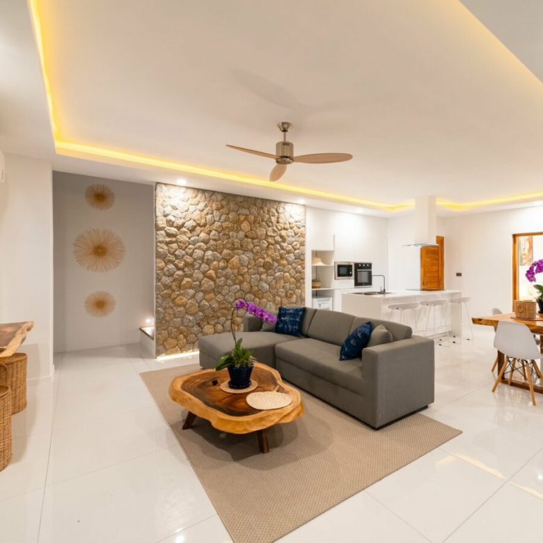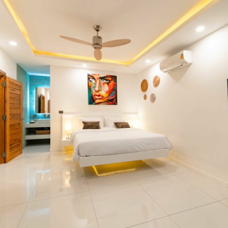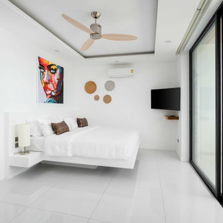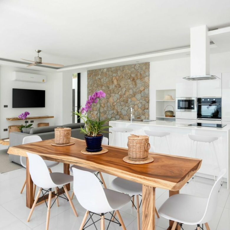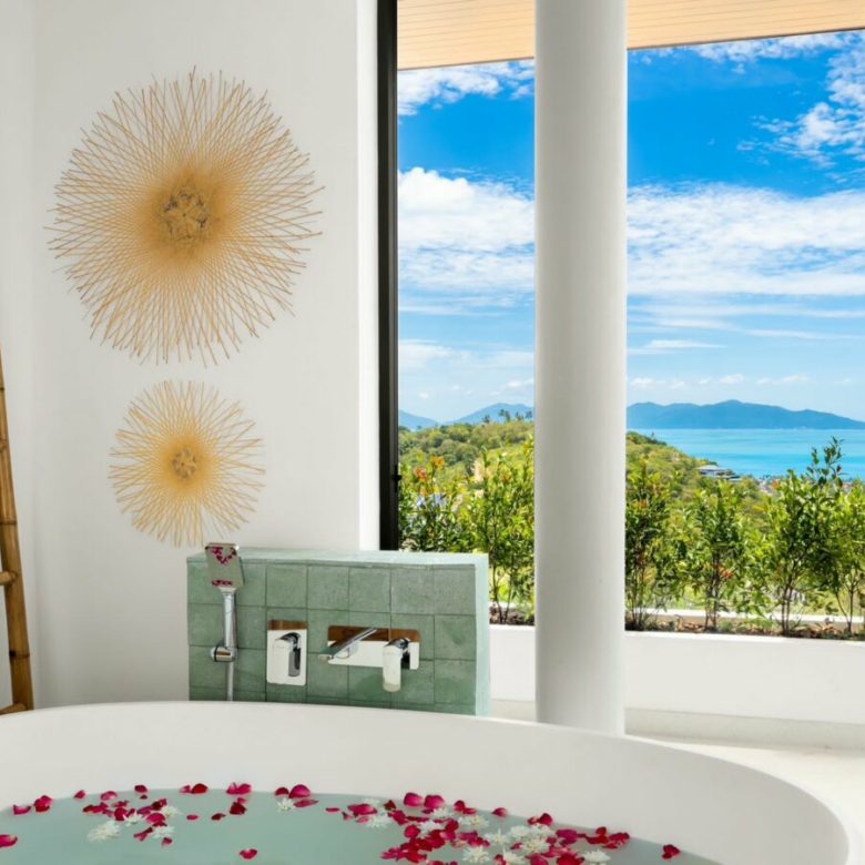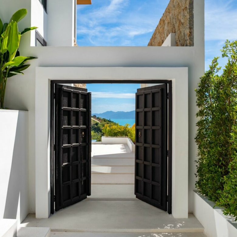 Splendid villa of 245.90 sqm, including 99.80 sqm of terrace, in the heights of Bophut with a magnificent sea view, built on a plot of 495.92 sqm. To access the villa, you will take a magnificent custom-made Balinese entrance door as well as an entrance of 24.60 sqm. This villa is made up of 3 bedrooms and each has its own bathroom with shower, toilet, double sink and mirror. There is also a corian bathtub in the master bedroom. They are all equipped with silent dual-motor fans from the Mr. Ken brand, which are found in particular in 5-star hotels, wardrobes and two of them are also equipped with a TV. Thanks to its large bay windows, the living area with living room, dining room and open kitchen, equipped with quality appliances, is very bright because it lets in natural light which illuminates it wonderfully. Enjoy the outdoors and the sea view with a very large 79.80 sqm terrace including its 30 sqm infinity pool, a 9 sqm sala and its 134.07 sqm garden. The coffee table, the dining table, as well as all the shelves of the villa are in Acacia and made to measure. The stairs are also in Acacia with Balinese finishes. The bathrooms, the outdoor shower and the swimming pool are tiled in natural stone from Bali. All the switches in the villa are tactile and from the Gracia brand. Premium white sandwash exterior coating does not heat up with the sun. You can therefore walk around barefoot in complete peace of mind without any fear of overheating or burning. Installation of the 5 kilowatt solar panel system without the batteries. A parking space at the bottom of the villa as well as an additional space before accessing the villa which can contain 3 cars and scooters. The location of the villa is a few minutes drive from the beaches and restaurants, including Fisherman’s Village. You will also be only 8 minutes’ drive from Makro and Big C Super center, 18 minutes’ drive from the airport and 15 minutes’ drive from Big Buddha. Villa sold with Thai company.