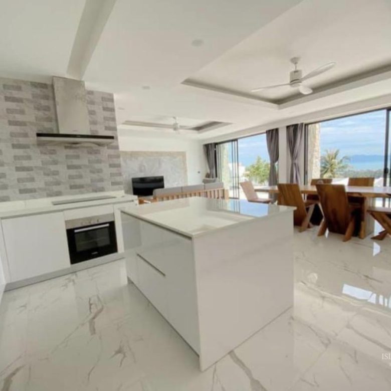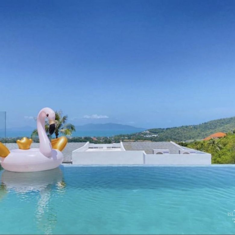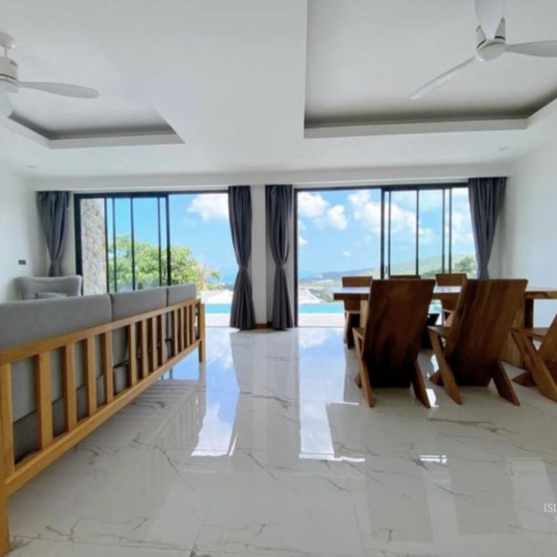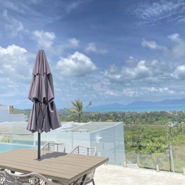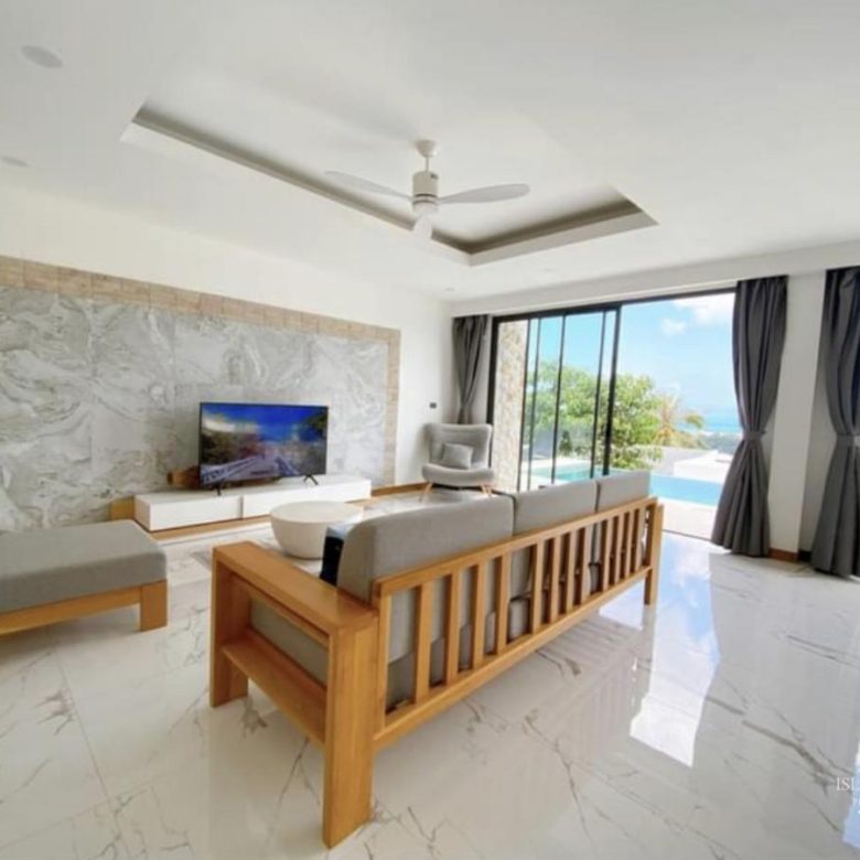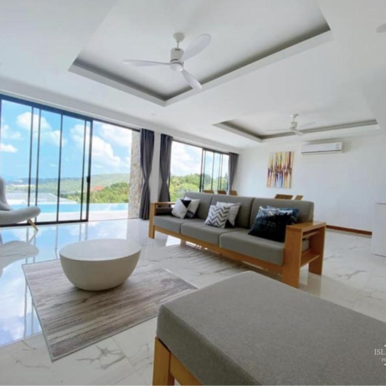 Three-bedroom pool villa with an amazing view located in Bophut hills that is only a few minutes away from Fishermanâs village, supermarkets, and restaurants. The villa features an open-plan living area, a fully equipped kitchen, and a dining area overlooking the sea view. Two rooms have double beds while another room has two single beds. The master bedroom has a bathtub. The villa has its own parking area and high speed internet all throughout the villa.