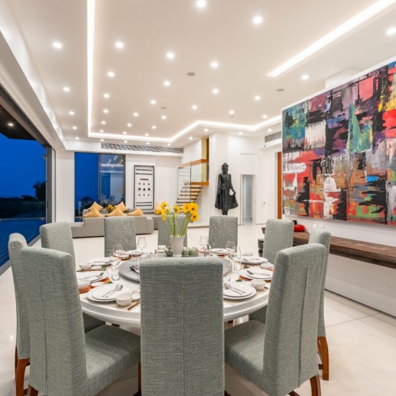 Eclectically designed and finished in earth tone and natural stone exteriors , you will know you have arrived somewhere special when you drive into the spacious parking area with its stone finishes and massive ornate courtyard doors that are cleverly placed to give continuity between them and the villas main entrance and terrace doors to bring that stunning view all the way to the courtyard as you walk through .