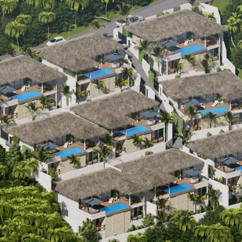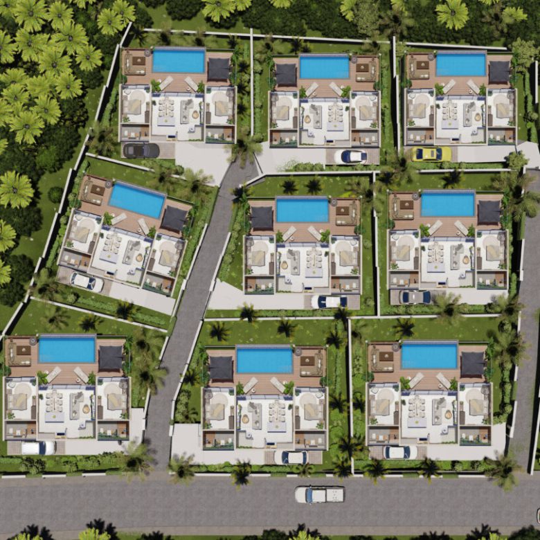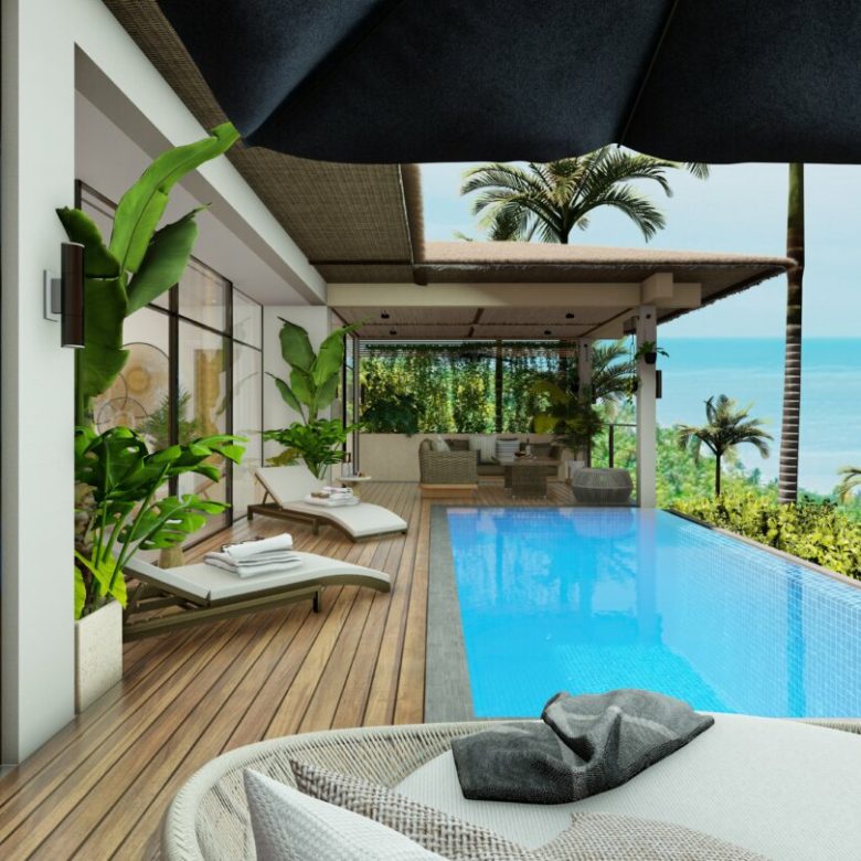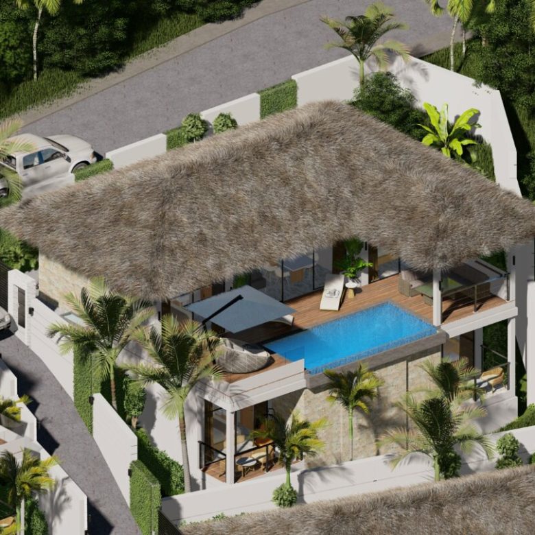 Each villa has an easy access with concrete road. Villas are offering a modern design mixed with a tropical feel. All units have 2 levels, First level is offering 2 bedrooms with a private outdoor sitting area, Second level has a spacious living room and bedrooms with an access to the infinity pool and sala. Every villa has a private parking.