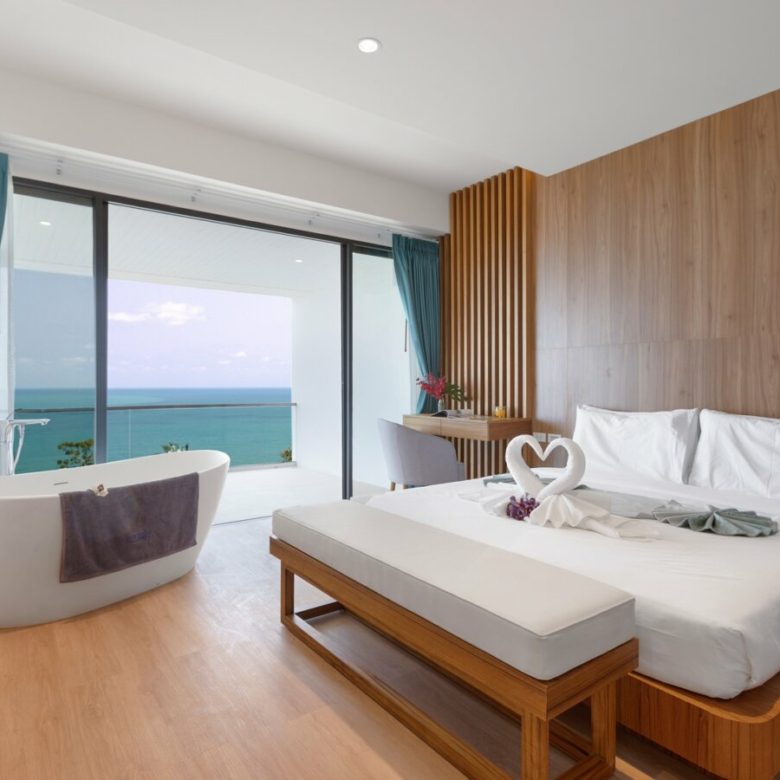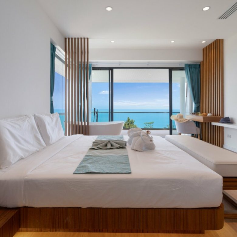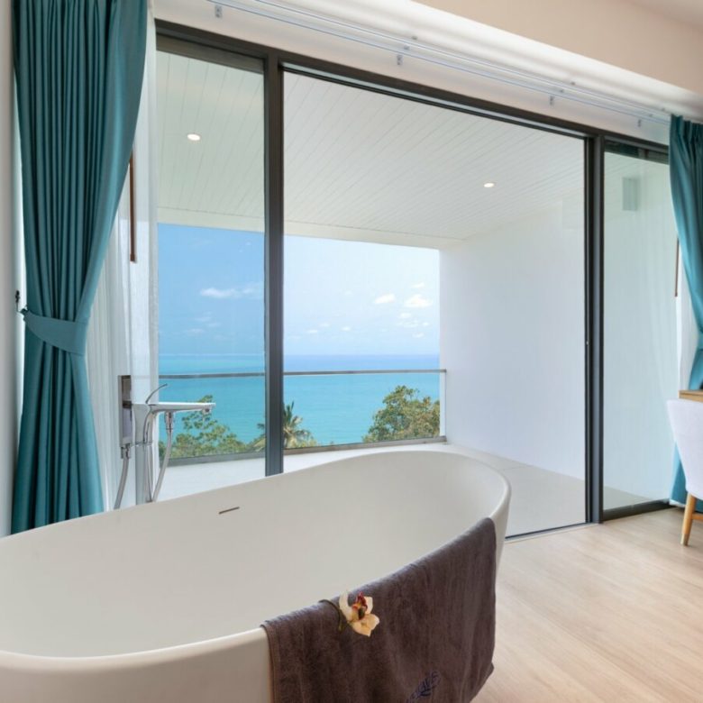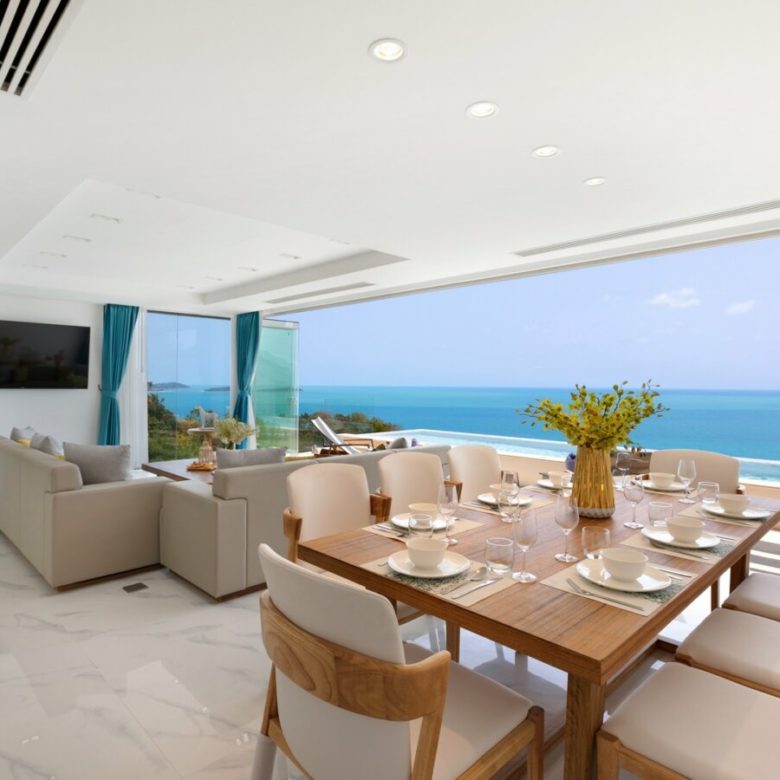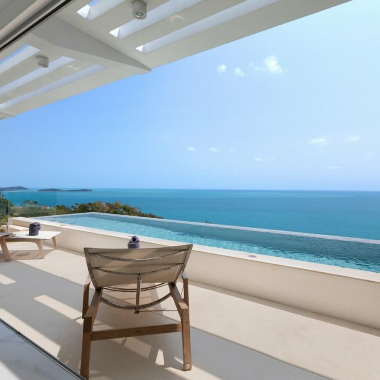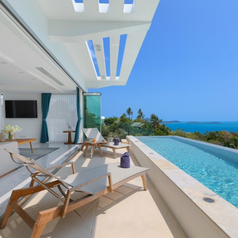 This modern beautiful semi-detached villa is located in the wave development and is built on two levels and enjoys one of the most stunning views over the gulf of Thailand and is located close to coral cove beach on the ridge that separates Chaweng beach from Lamai .