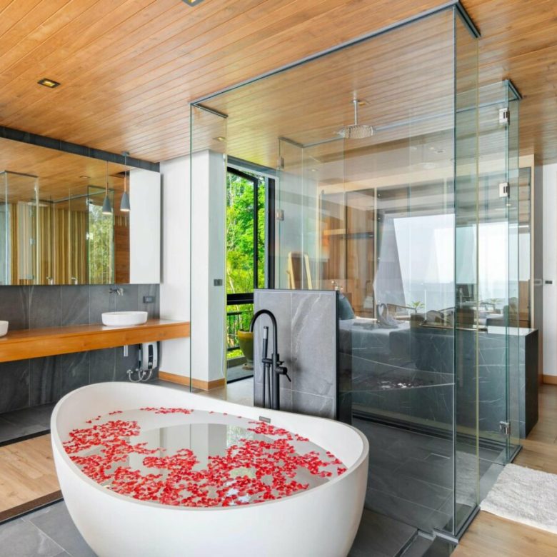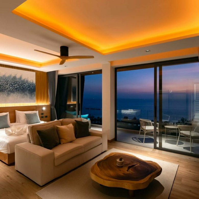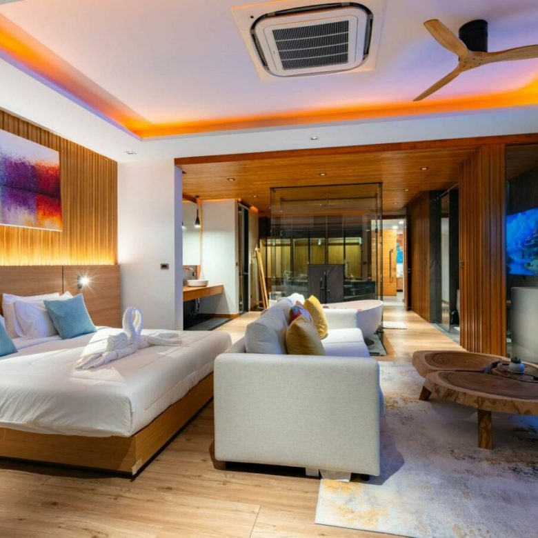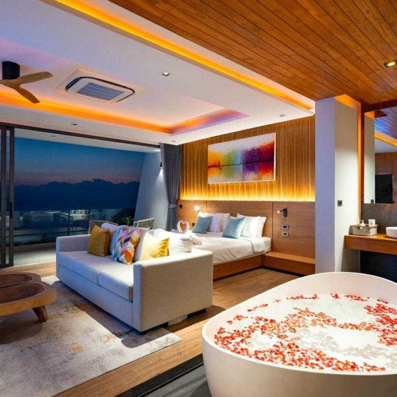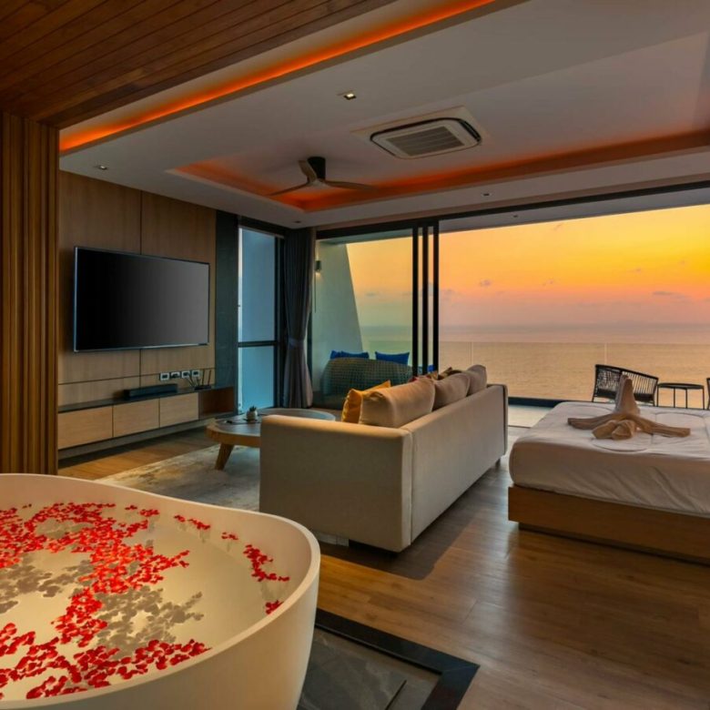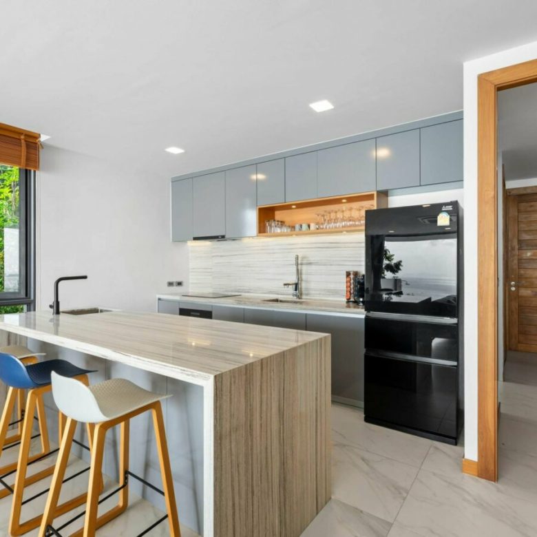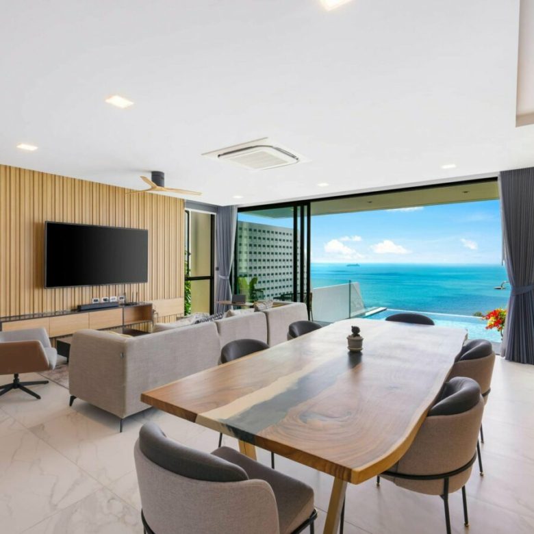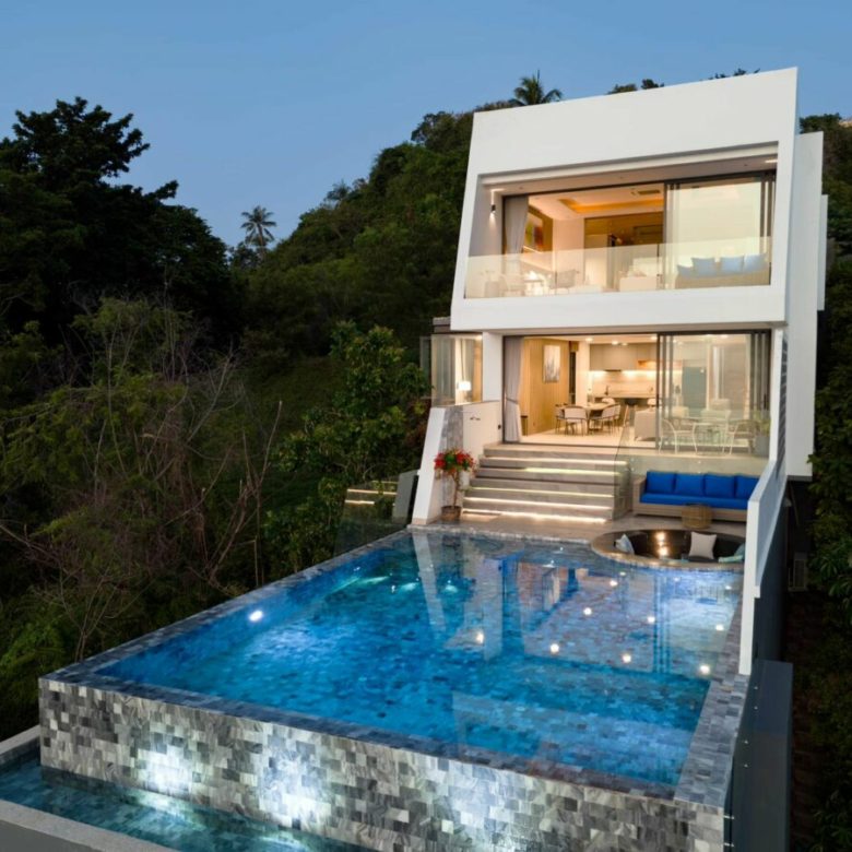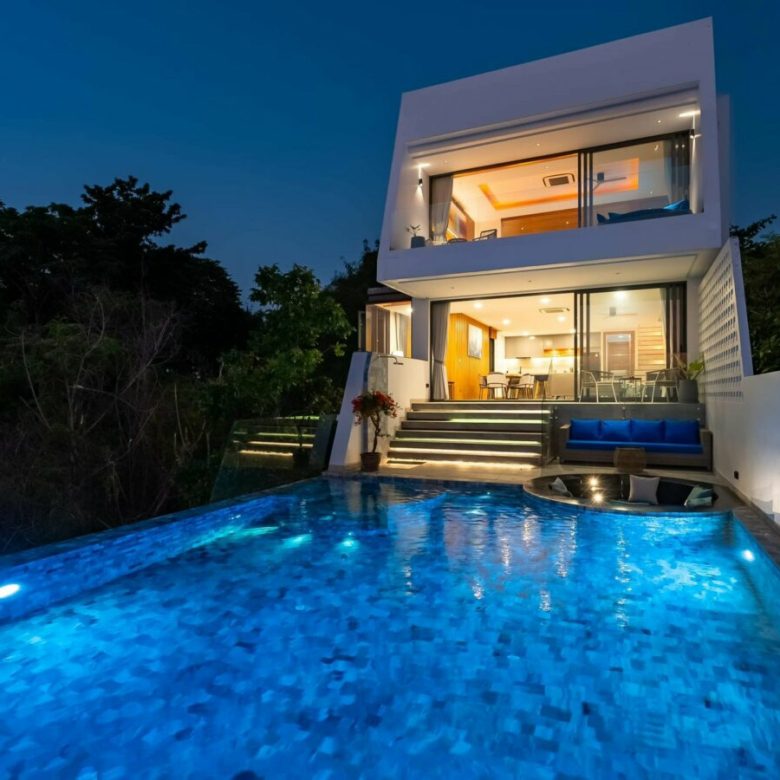 Very stylishly designed and taking full advantage of the landscape , this vertical villa is designed as a low operating cost tropical penthouse with a breathtaking modern designed master bedroom at the top with stunning views , a spacious living room with dining and kitchen on the immediate level below with it’s beautiful pool deck with a sunken outdoor seating a tea to take in the views , a 6 person jacuzzi and an infinity edged salt pool with overlooks the carpet of coconut trees and the sea below . Envisioned to be a low stress home where owners would not have to worry about maintenance of large gardens and many plants and can come and go and they please with minimal costs , the property is a perfect turnkey solution.