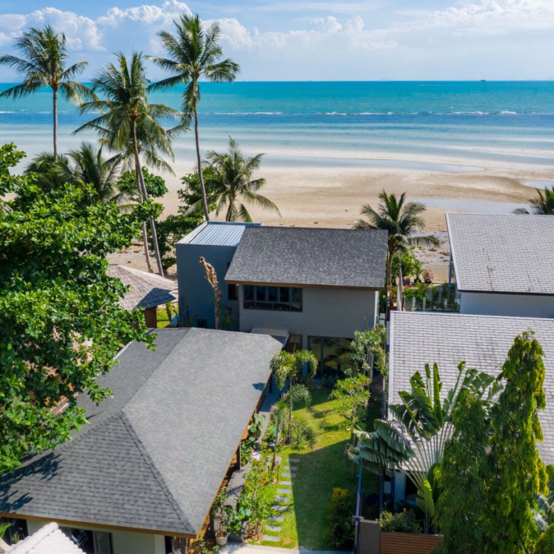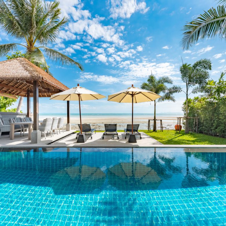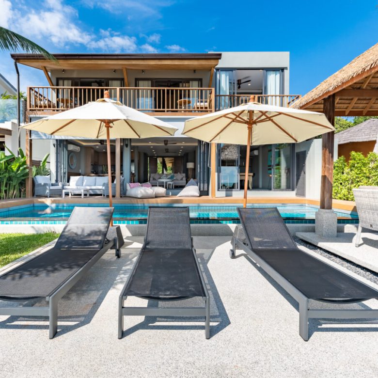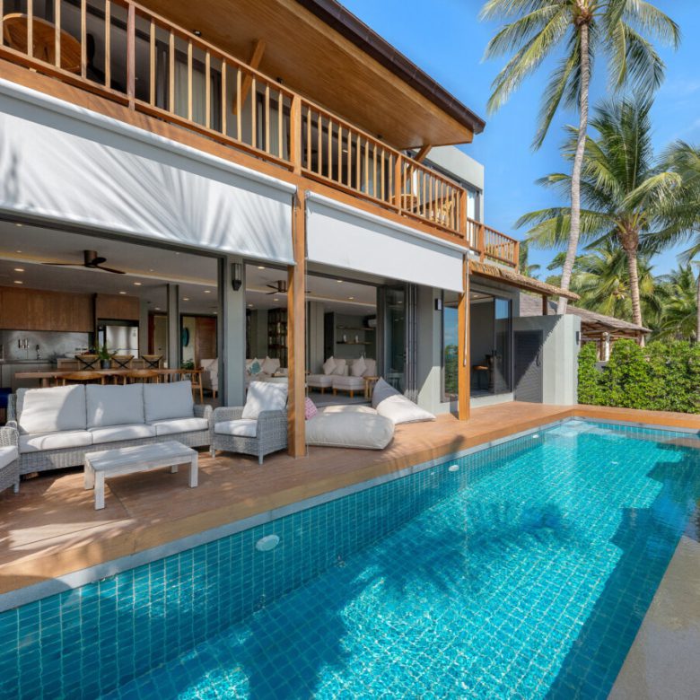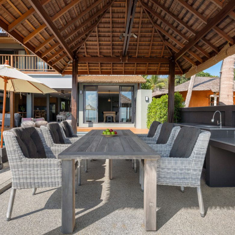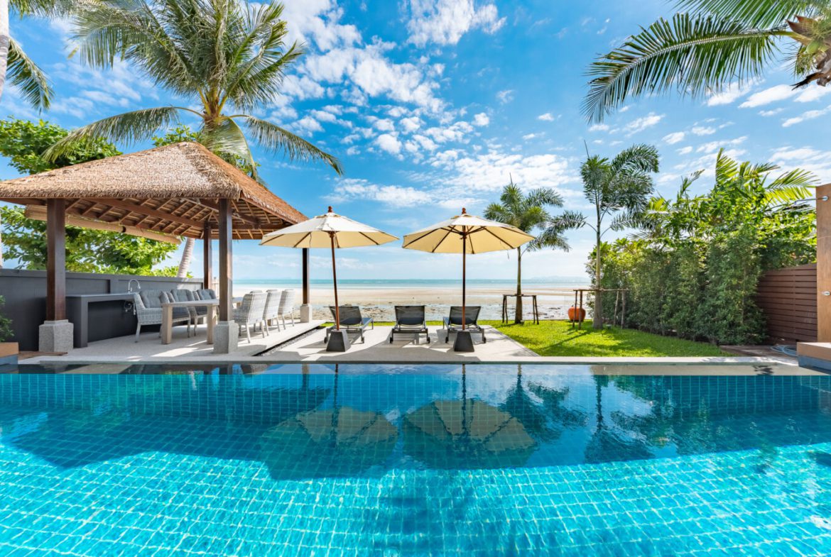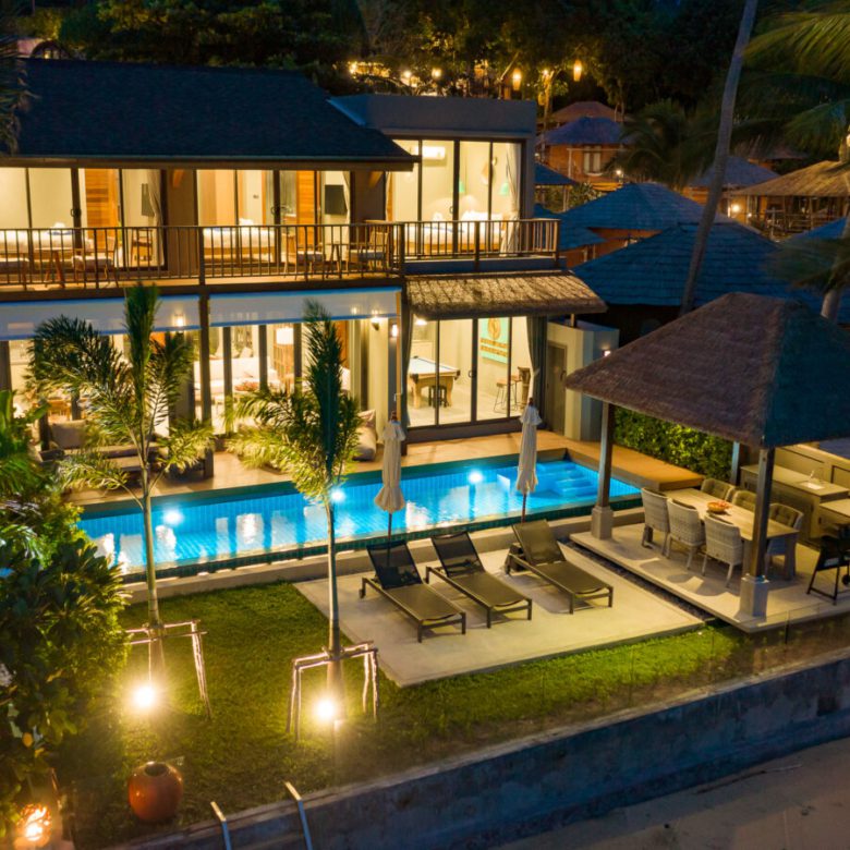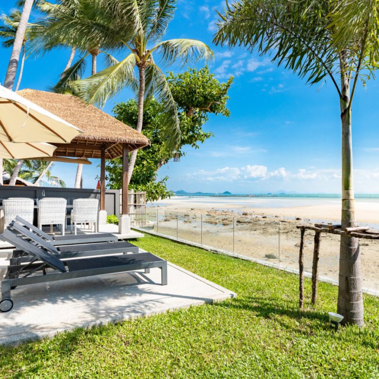 This stylish, tropical, luxurious, breezy and absolute beach front combines form and function and offers magnificent views of Samui’s small islands and the sea beyond. With 520 mÂē of indoor/outdoor living space with 5 en-suite bedrooms, large living area, beachfront infinity pool, garden, air-conditioned, gym, professional pool table, BBQ and sala, this villa is perfect for up to 10 adults.