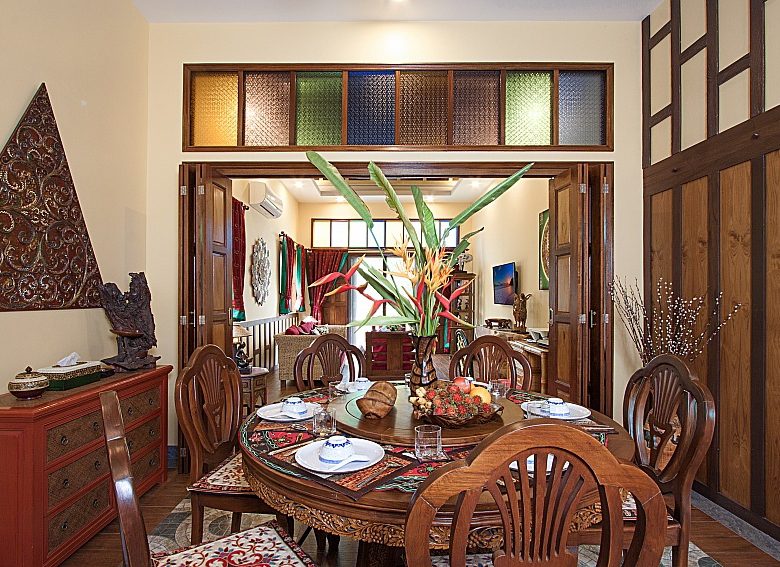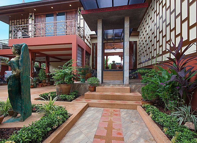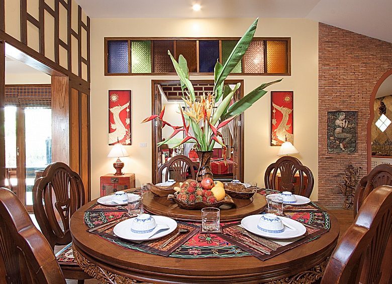 Character. The Designer of this new authentic Siam Style house took features dating back 150 years from Chiang Mai; and re-created them into a high class modern day construction, with the concept aimed for “quality of living of our century”. The result is a spectacular fusion of traditional Siam elements and western design sensibilities. The grand entrance greets you with a huge electric gated drive way with a peaceful seating area to the left. A gorgeous green garden with a stone pathway stretches around the right side of the villa and has a relaxing seating /BBQ area tucked away in the corner.