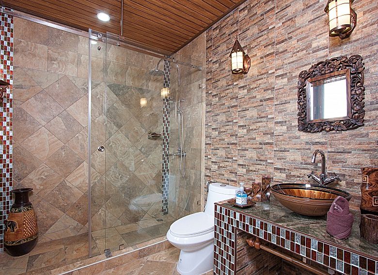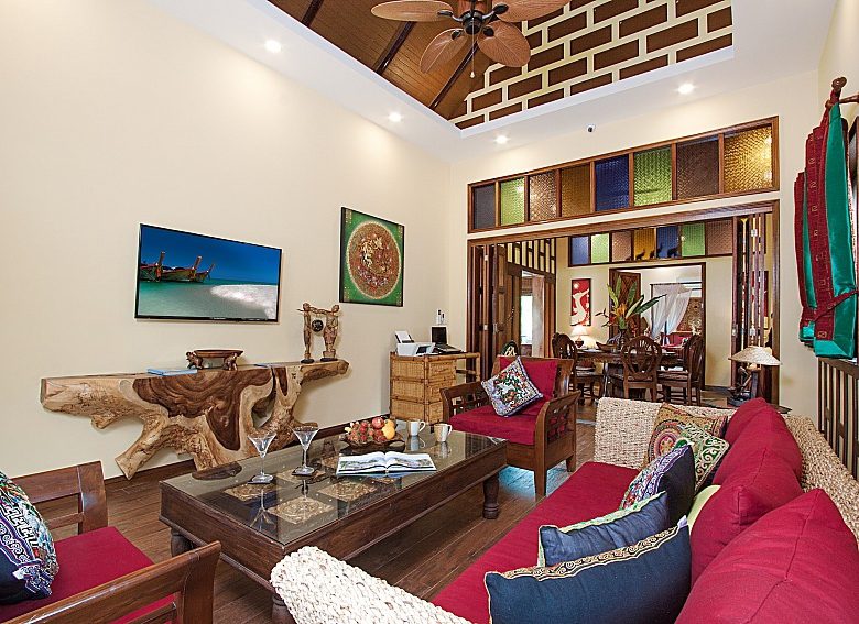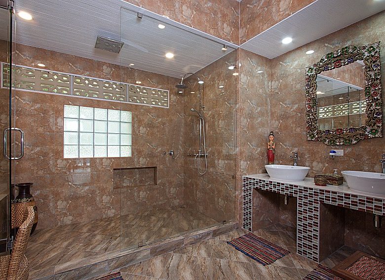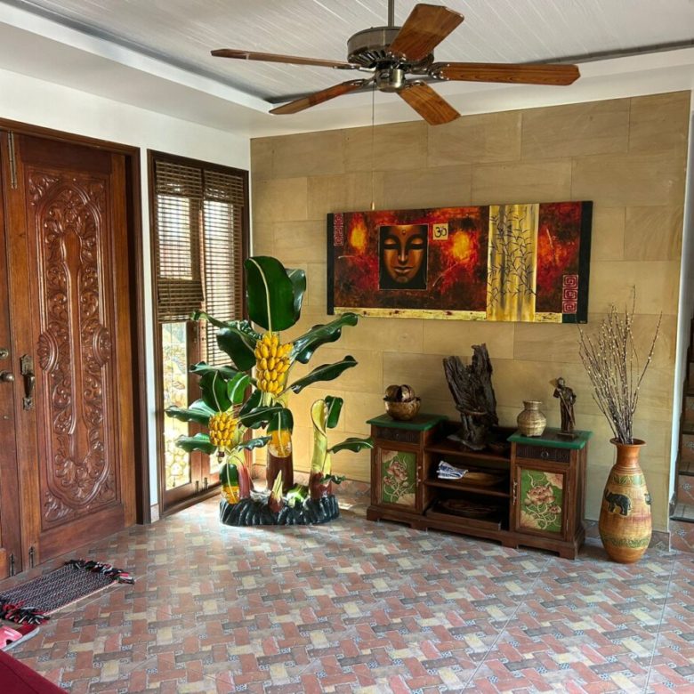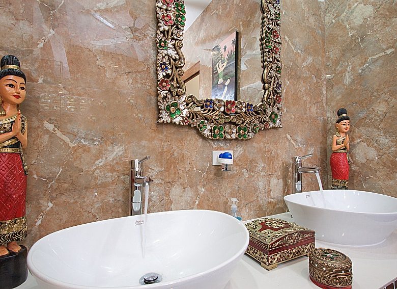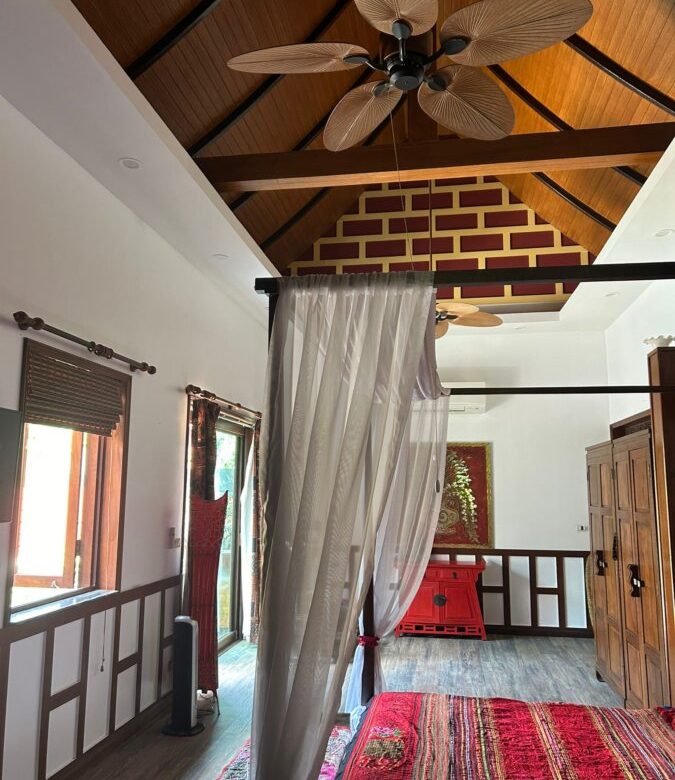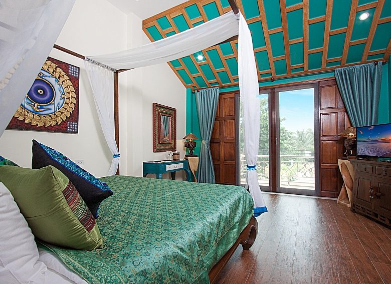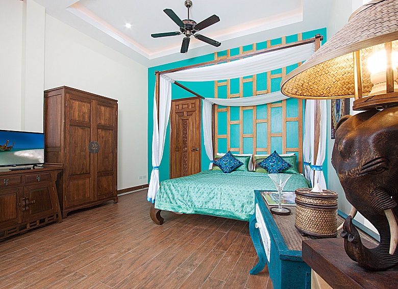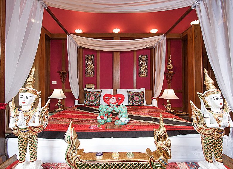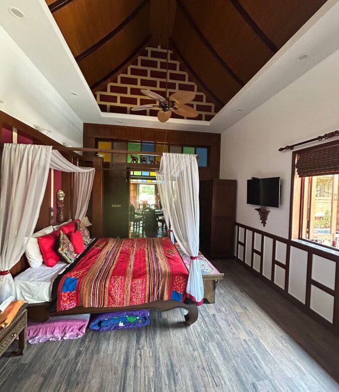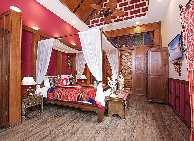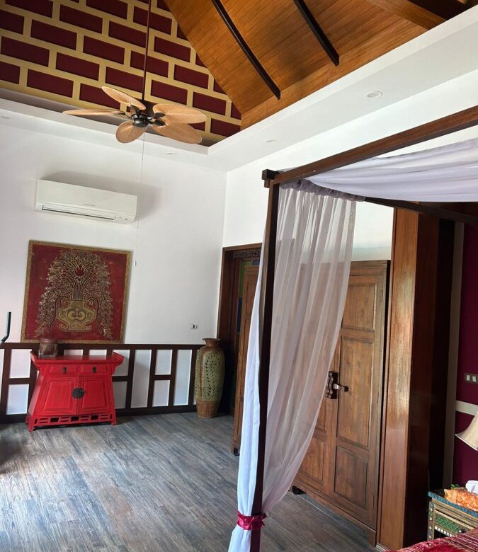 From the hallway, to the right of the property the stairs lead you to two bedrooms. Both offer spaciousness and comfort featuring a beautiful four poster king size bed, dressing area, television and wardrobe with traditional and” sea green” pastel décor. With a balcony attached to the room, natural light fills the space. The second bedroom again has a king size four poster bed, television and wardrobe with a balcony and” red classic Siam styled” décor. A modern classic tiled bathroom with great features and a generous walk-in shower is shared between the two bedrooms AC and high-speed internet in built mosquito blinds to each window.
