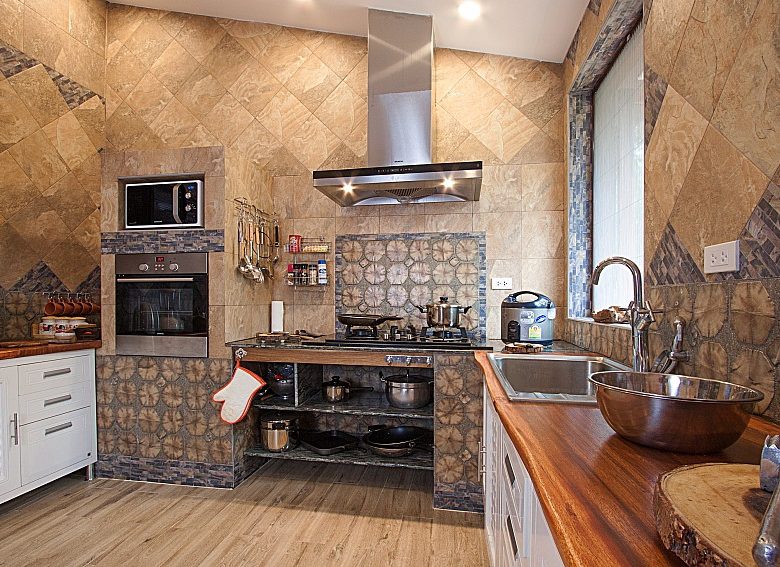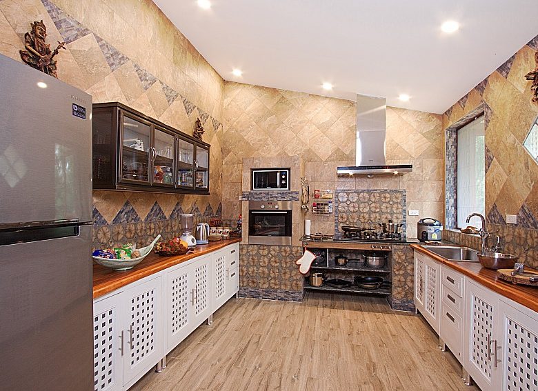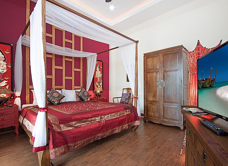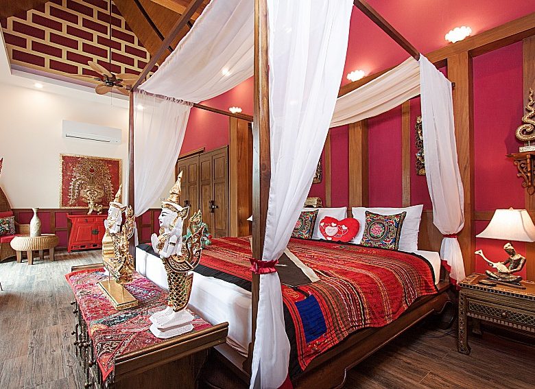 Entering the hallway you are immediately drawn in to the amazing energy of the house. The hallway introduces you to the story of the property with opulent handmade sculptures, furniture and artwork from Chiang Mai. Through a glass door you have a view of the outdoor private pool. Walking to the right of the property, following the rustic brick wall, you will find the living and dining area. A sizable handmade wooden circular dining table with chairs leads you to the living area, offering comfortable seating that oozes character and offers a fantastic place for you to put your feet up, watch television and relax. The room is lit up with natural light coming through from the windows and balcony doors. Stunning features include a colourful stained glass panel along the topside of the wall, with hand crafted artifacts and Thai style art work The exquisite features take you then to the highly modern and thoughtfully designed kitchen which is tiled throughout with a wooden work top and pristine white cupboards. The kitchen is fully equipped with all the latest modern appliances which are often hard to come across in Thailand. The Large Master bedroom’s atmosphere stuns with its wooden and Siam red décor and four poster king size bed. With dark wood tiled floors and wooden accents add traditional flavor, complimented with three handmade traditional wooden wardrobes.