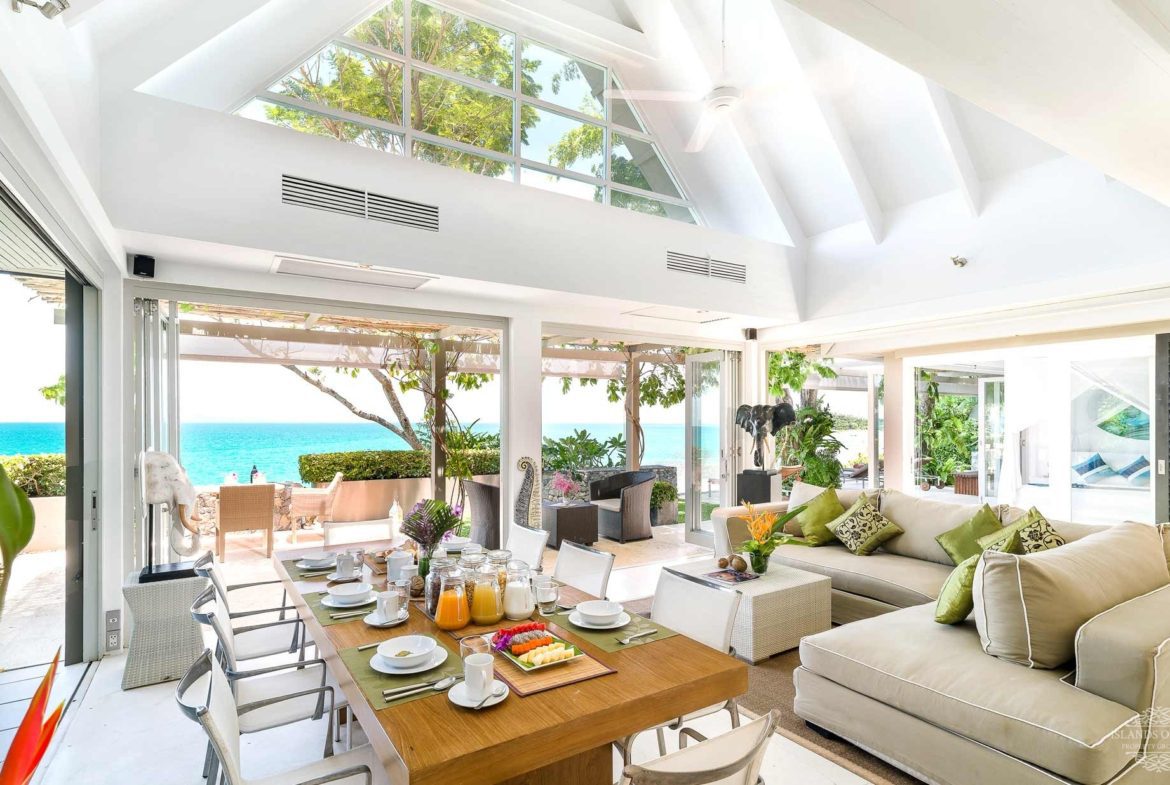 The second pavilion boasts a large open-plan living and dining area complete with a fully-equipped kitchen and foldaway glass doors that epitomise the tropical indoor/outdoor philosophy. Upstairs on the mezzanine level is the TV den, which can easily be converted into a third double bedroom thanks to two single beds, sofa bed, and blackout curtains, and comes with a fully equipped en-suite shower room.