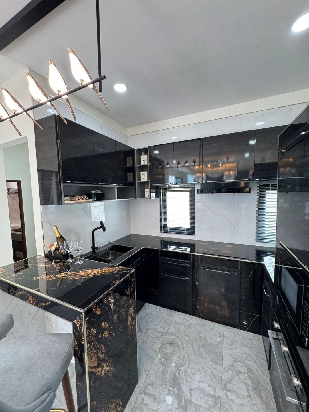 The villa features a fully equipped Kitzcho kitchen with premium appliances and a large modern refrigerator, ideal for both home chefs and casual dining. Large sliding doors connect the indoor living areas to the pool terrace, creating a natural flow between interior and exterior spaces.