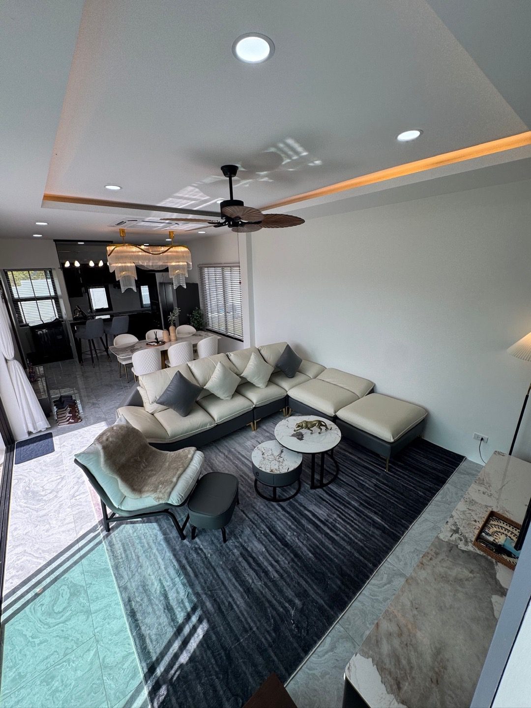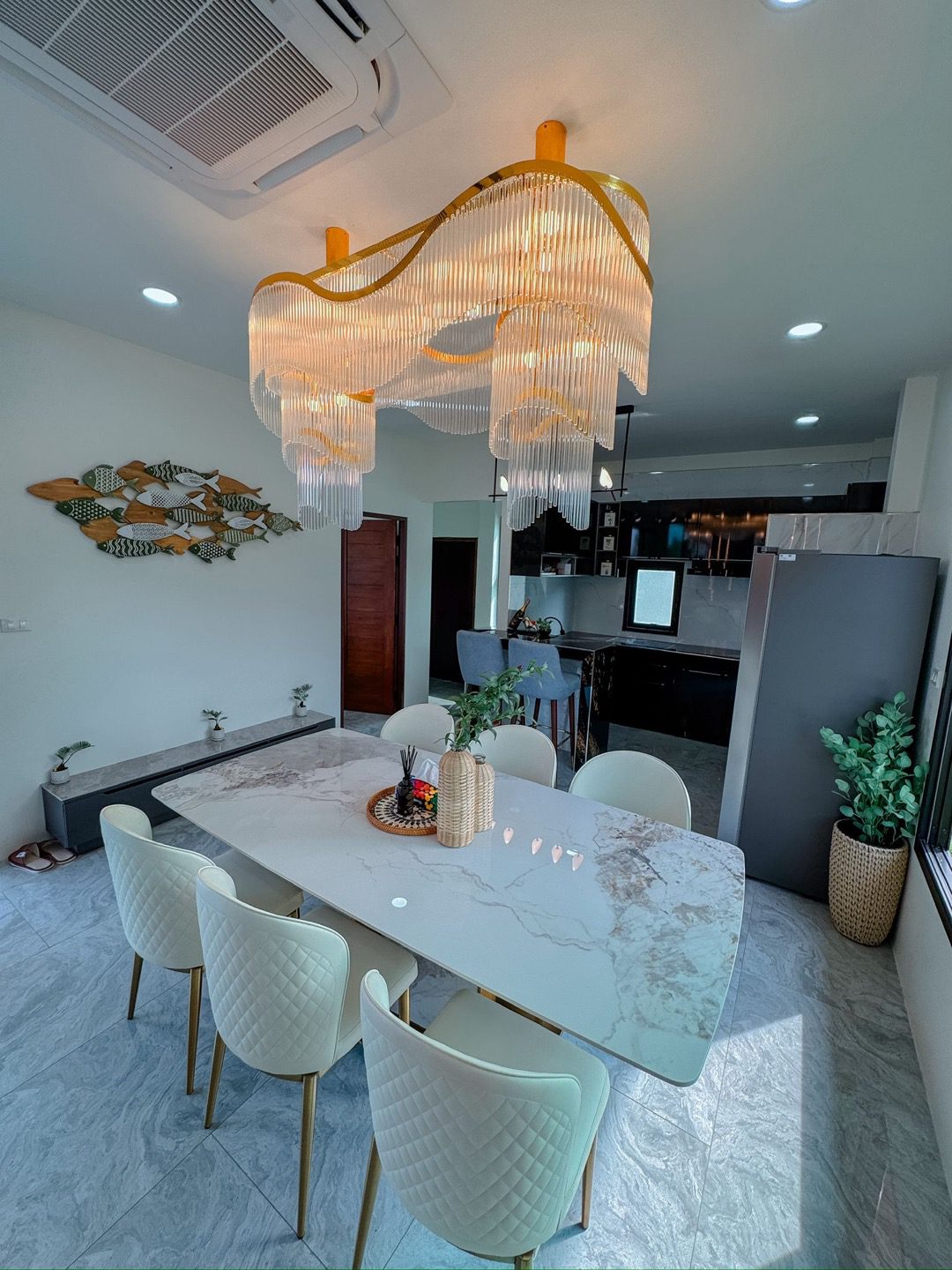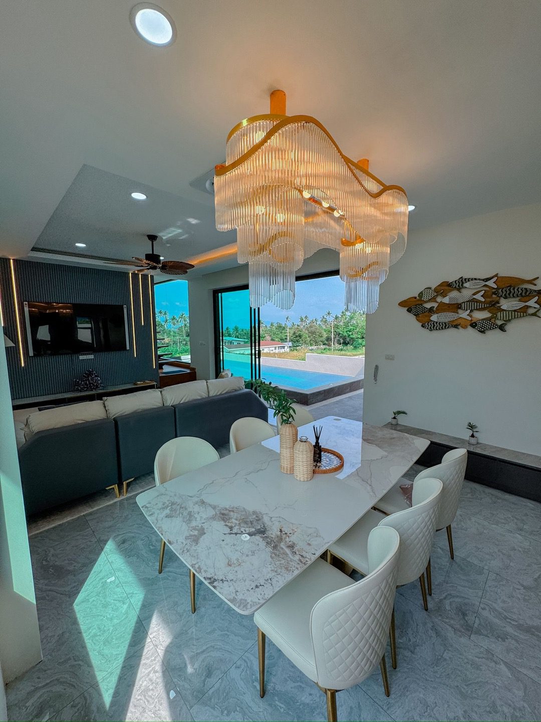From the moment you step inside, a spacious open-plan living area welcomes you, filled with natural light and seamlessly connected to the outdoor terraces and 3.5 x 8 m saltwater infinity pool with Jacuzzi. The living room is furnished with a 75” smart TV and plush sofa set, perfect for family time or entertaining guests. Adjacent to the living area, a sleek marble dining table invites leisurely meals while enjoying the gentle ocean breezes.