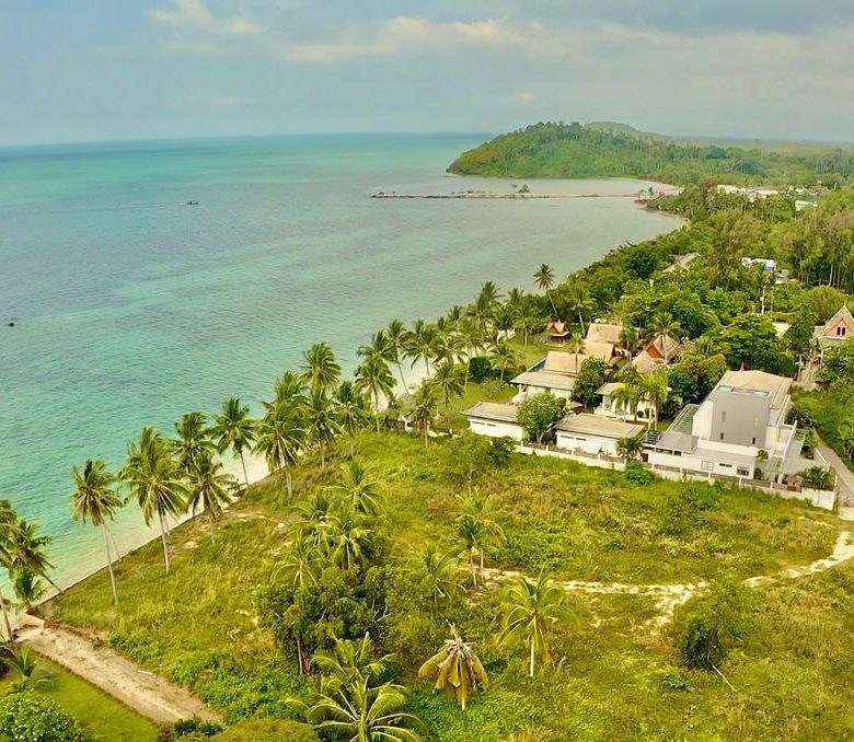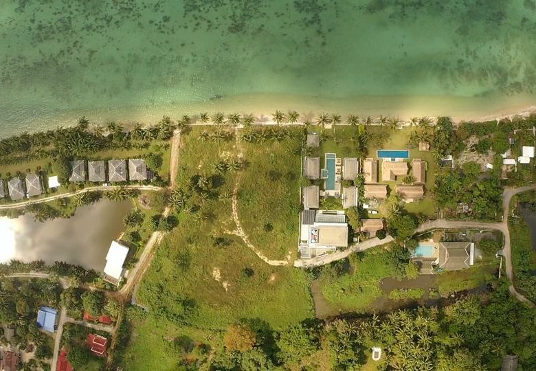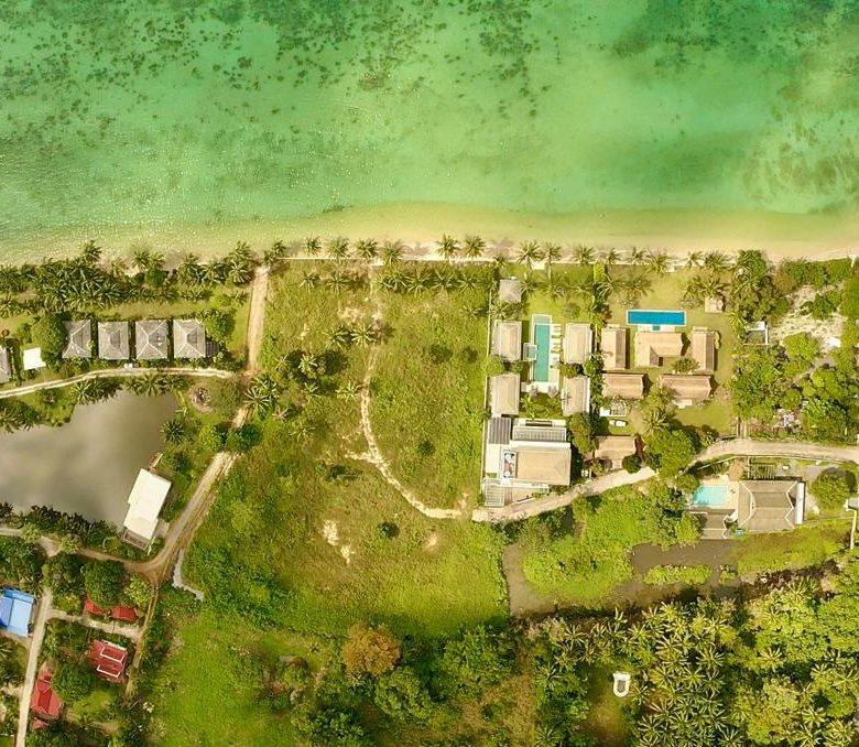Sunset-facing and fully infrastructured with a retaining wall on the beach and an access gate , this flat piece of prime land is close to expensive villas and 5 star hotels on the west coast and enjoys a powdery white sand beach and easy swimming with no corals .