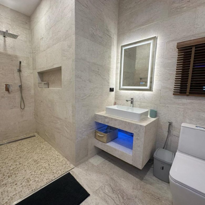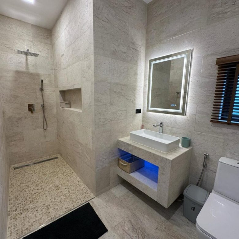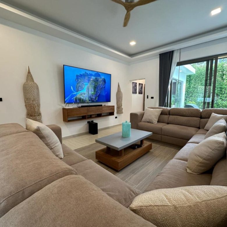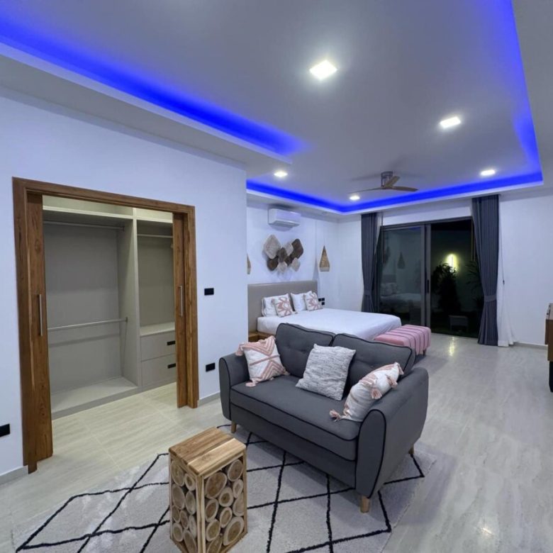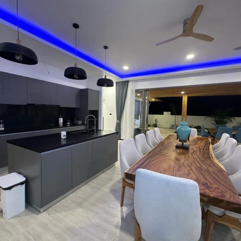 The covered parking space has space for 2 cars and motorbikes. The finish of the villa is perfect. If you are looking for a villa where you can feel at home, then this villa is your wish. The villa is fully furnished and has a European kitchen.