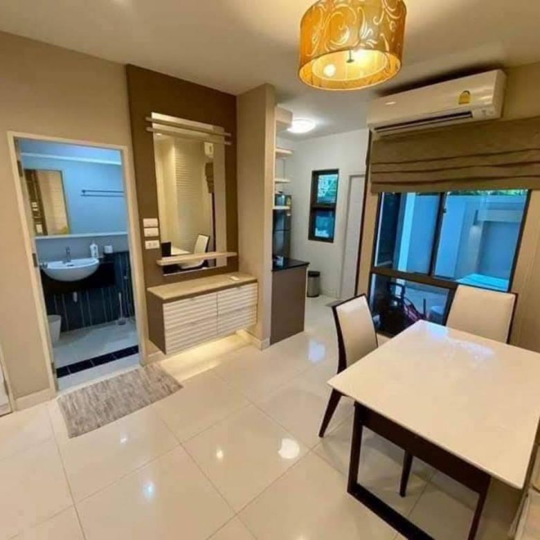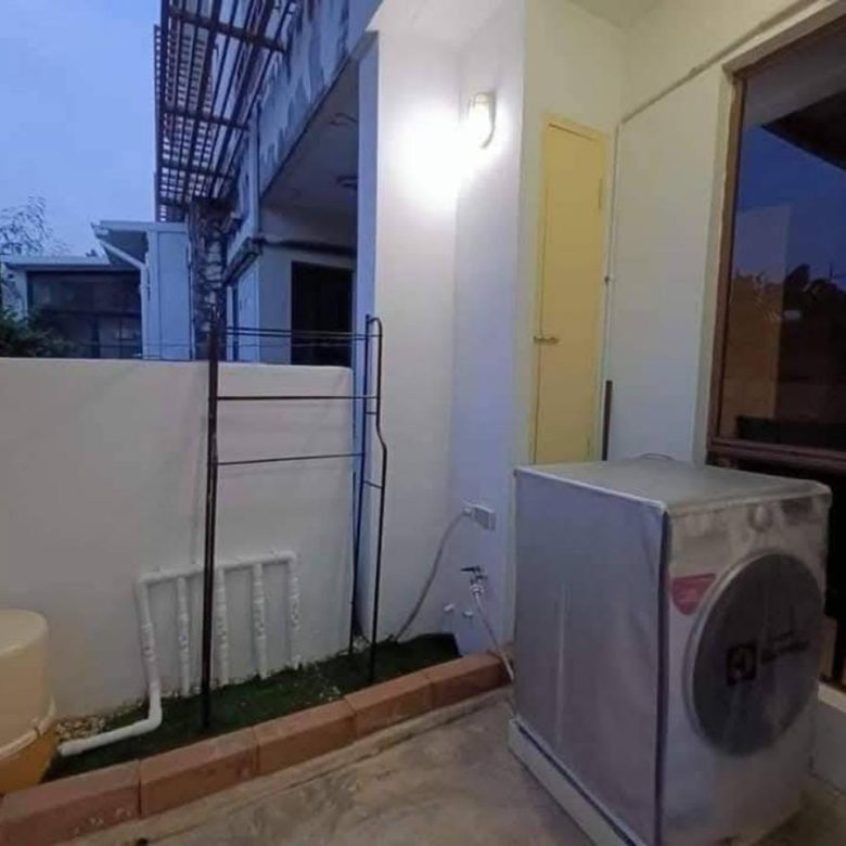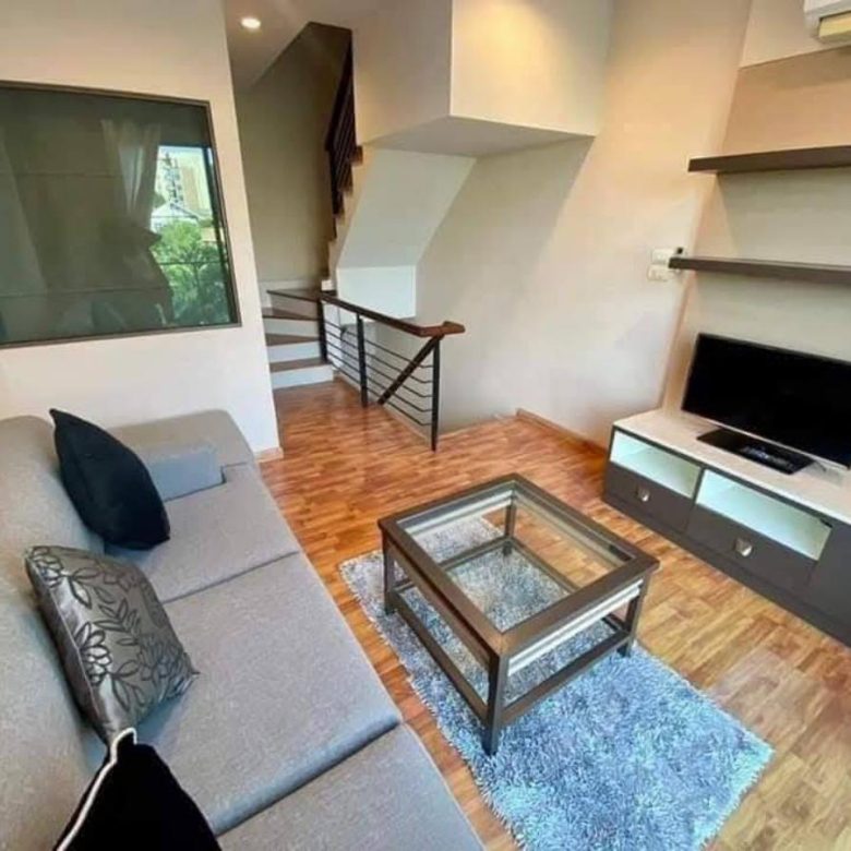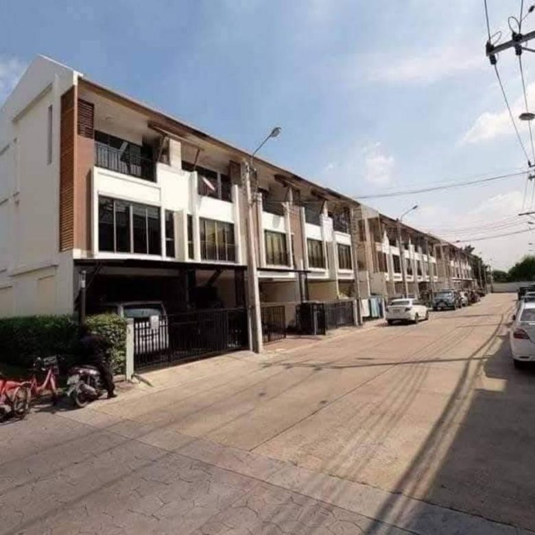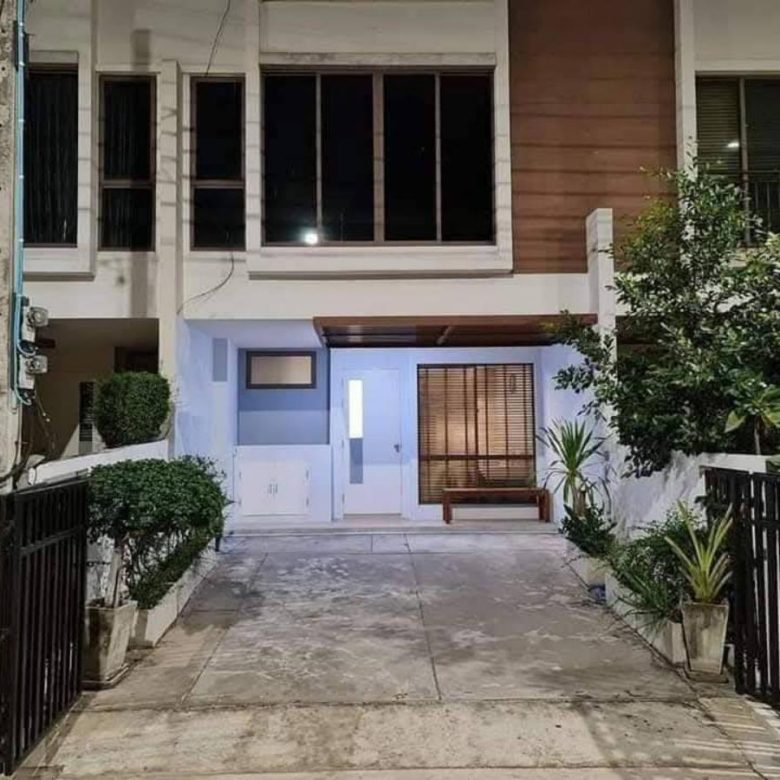 a 3-story townhouse on Sukhumvit Road, is in a prime location near the Sukhumvit 62 Expressway and Bang Chak BTS Skytrain, with multiple access points (On Nut 30 and 24). Fully furnished and ready to move in, the unit features 3 bedrooms, 4 bathrooms, 2 living rooms, a backyard, a kitchen with an electric hood, 5 air conditioners, a TV, a refrigerator, and a water heater