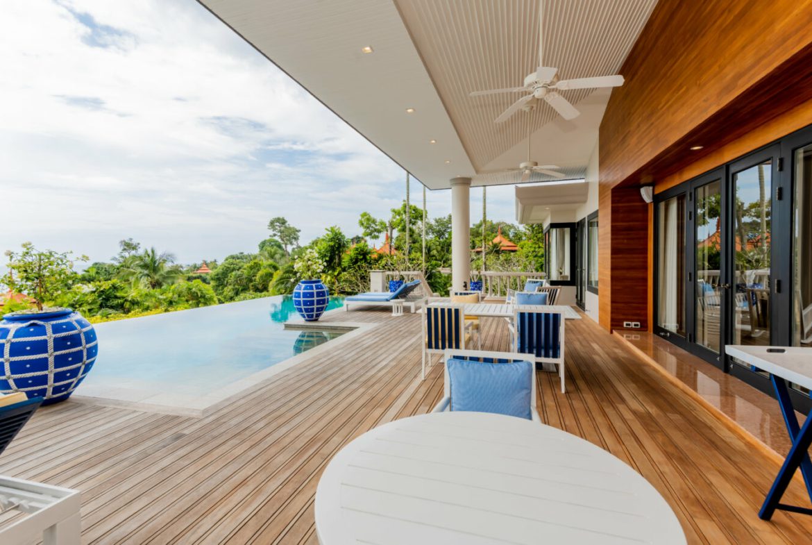 This newly renovated residence is located above the oceanfront villas and has stunning sea views. This villa has a total area of 630 square meters of space, 300 m of which are air conditioned. Arriving onto the main pool deck via stairs from the gardens below, the entrance opens into a large living and dining pavilion. The villaâs fully equipped modern kitchen, which includes a personal chef and butler, is available to guests. The bathroom includes a large built-in tub as well as a private steam shower. The two main bedrooms are accessible from either side of this pavilion, with a smaller third bedroom ideal for a small family or a small group of friends.